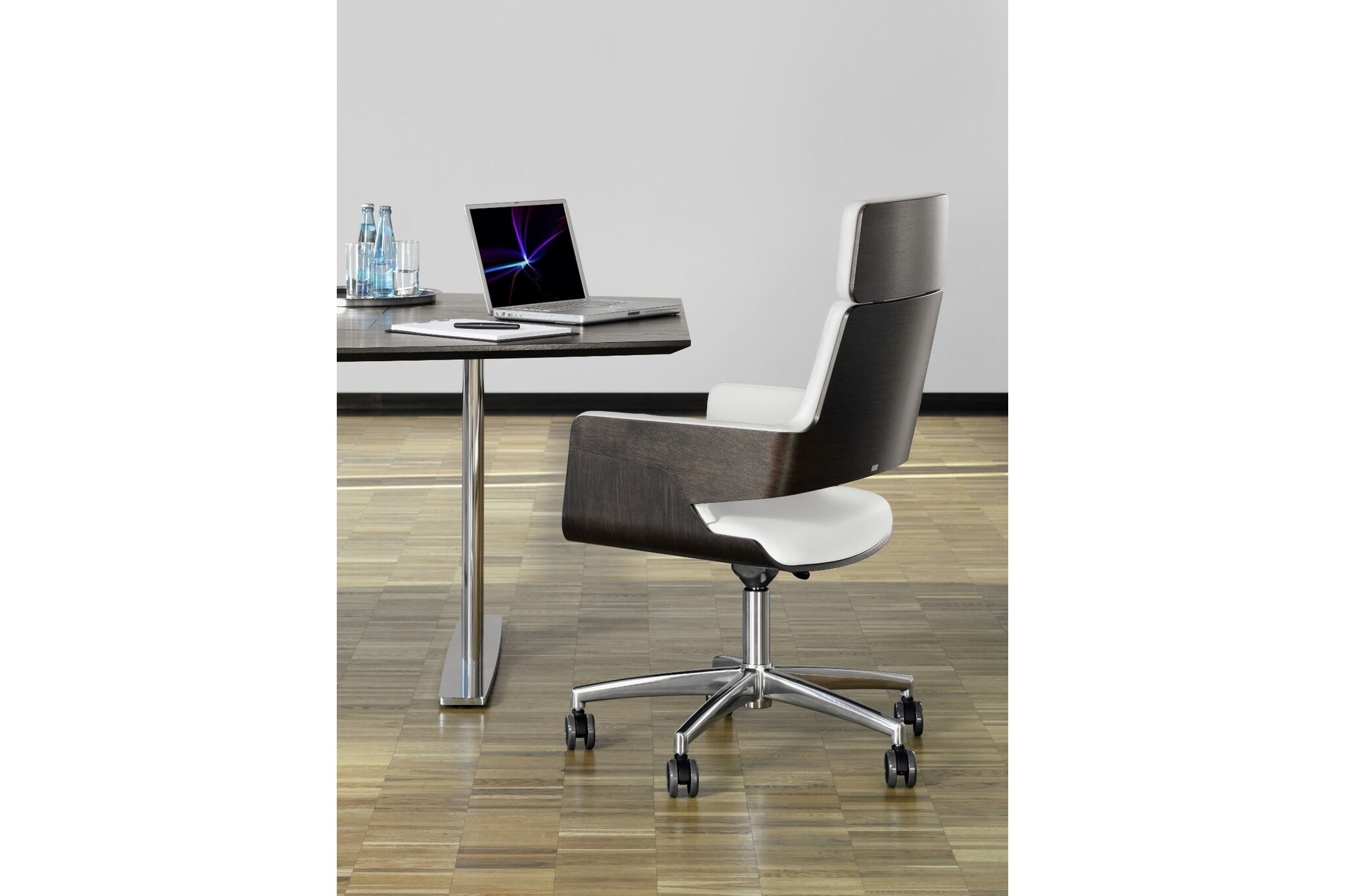 De Thonet S845 stoel kan toegepast worden in ontvangst- en vergaderkamers. De zitschaal is gemaakt van voorgevormd multiplex. Door het gebruik van fineer in diverse houtsoorten en beitskleuren alsmede door de verschillende soorten bekleding in stof en leder past de stoel binnen verschillende kantoorstijlen. Zo ook in die van u! De Thonet S845 is leverbaar op een 5-teens kruisvoet op wielen of glijders. De draaibare stoel heeft een terug draai mechanisme, waardoor de zitkuip altijd weer automatisch in de oorspronkelijke positie terugdraait.