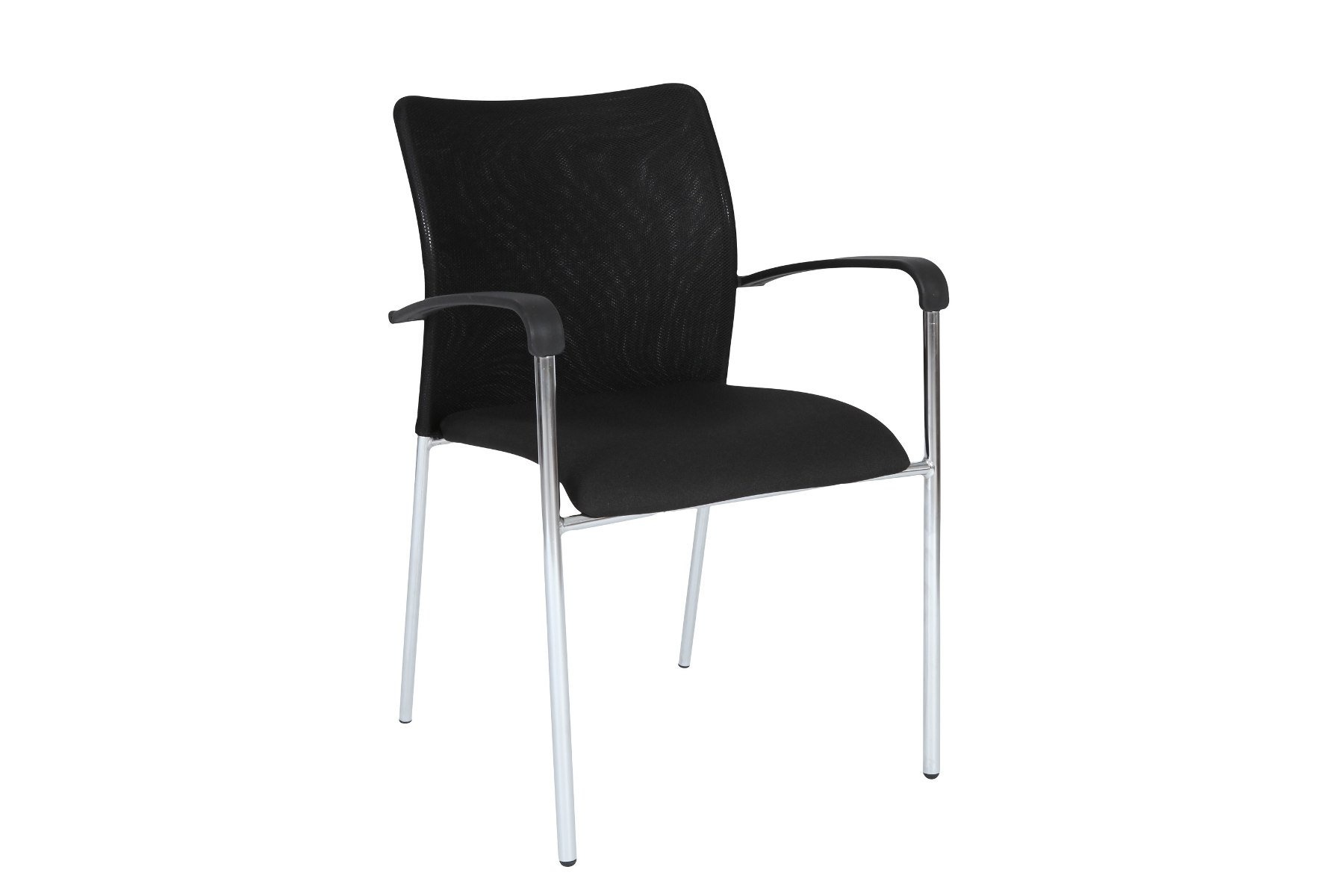 De rugleuning is in zwart mesh en het frame is uitgevoerd in chroom. De stoel heeft 4 poten en de armleuningen zijn voorzien van een kunststof armlegger. De zitting is van een slijtvaste zwarte stof (100.000 Martindale). Martindale is een meeteenheid die aangeeft hoe slijtvast de stof is, 100.000 is voor een vergaderstoel erg hoog dus wij kunnen u garanderen dat deze stoel een aantal jaar meegaat.