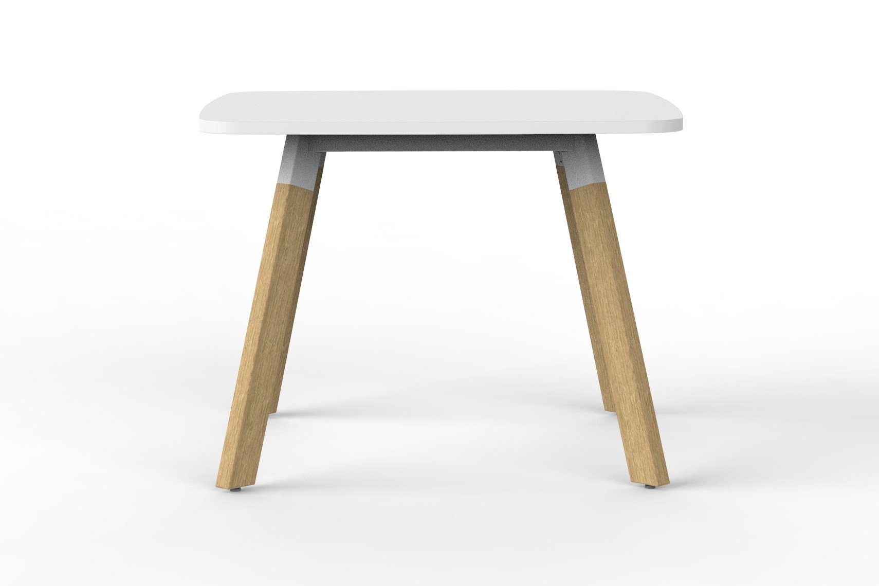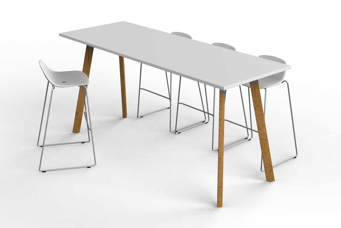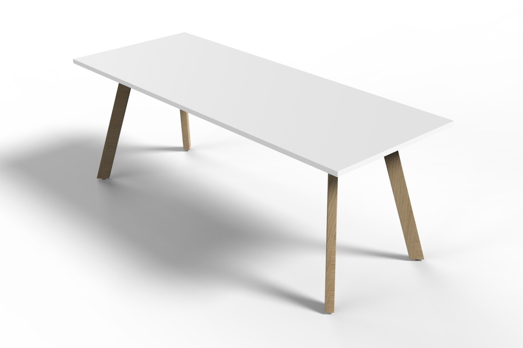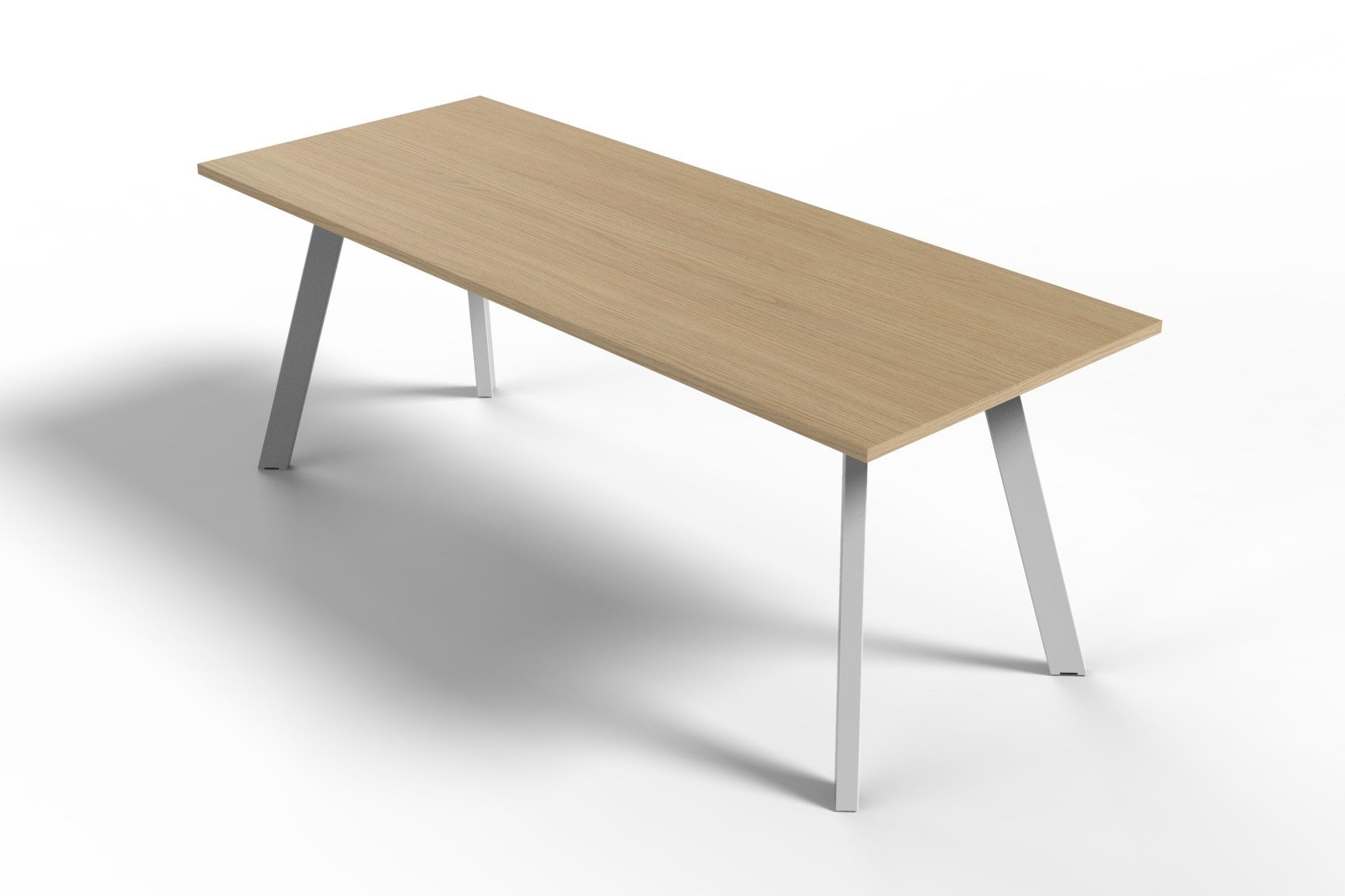 De vergadertafel is leverbaar in verschillende soorten afmetingen. Het onderstel van de tafel is leverbaar in hout en metaal en het metaal is verkrijgbaar in de kleuren wit en zwart. Het tafelblad is gemaakt van melamine en heeft rechte hoeken. De tafels zijn niet aan elkaar te koppelen.