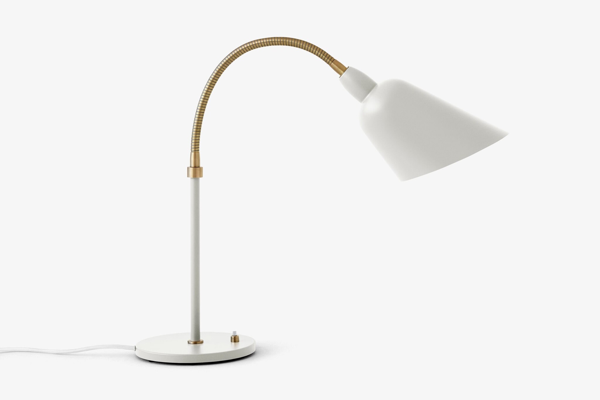 De &Tradition Bellevue lampen zijn leverbaar in nieuwe kleuren en een mix van materialen: satijn gepolijst messing, zwart met messing, antraciet met een brace en versies mengen ivoor of grijze beige met messing.