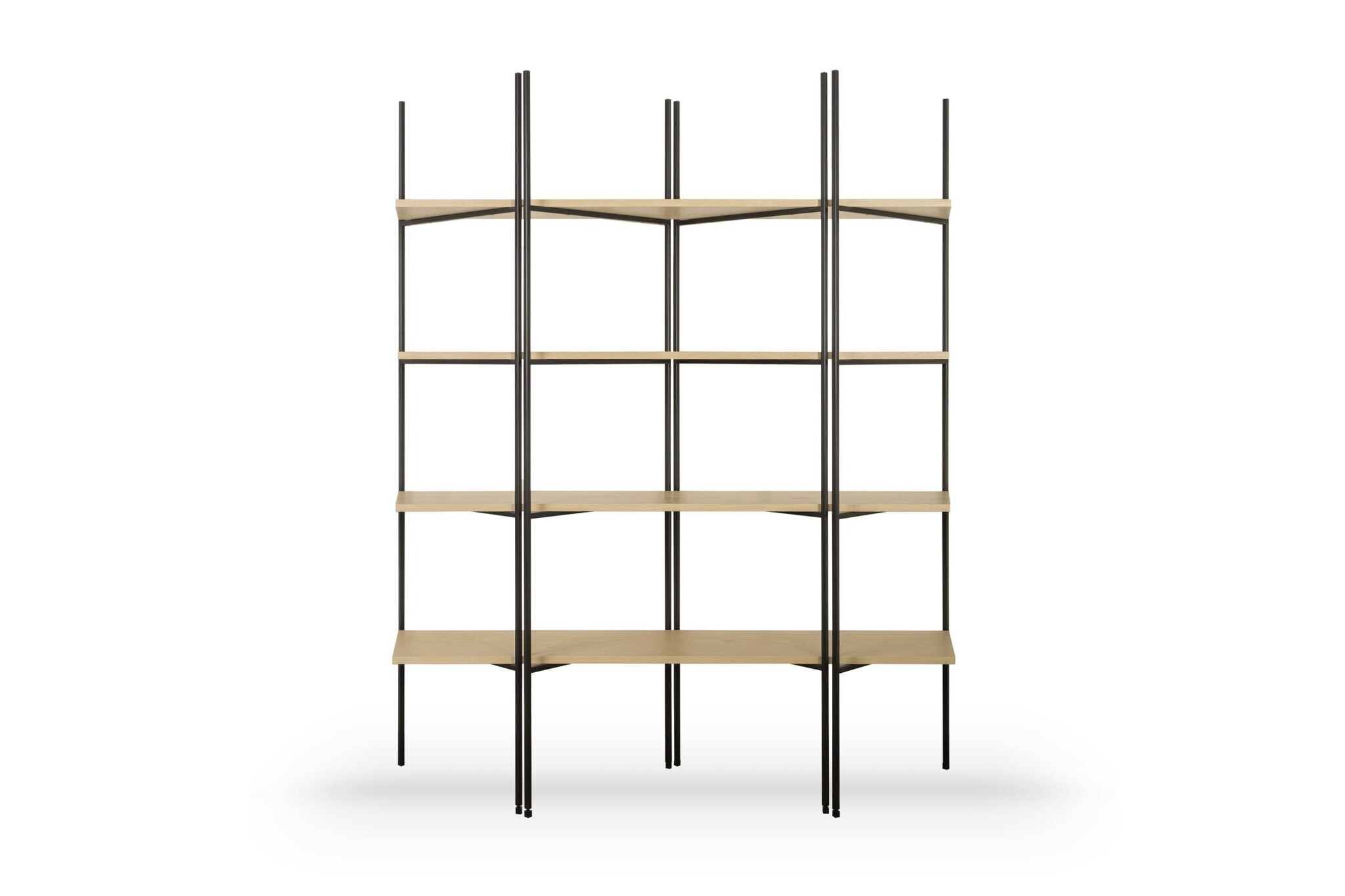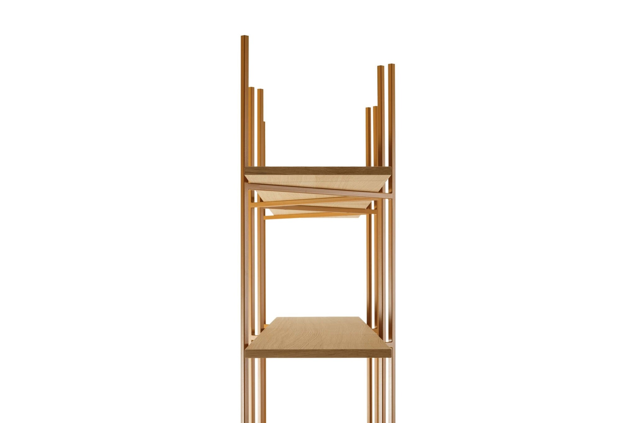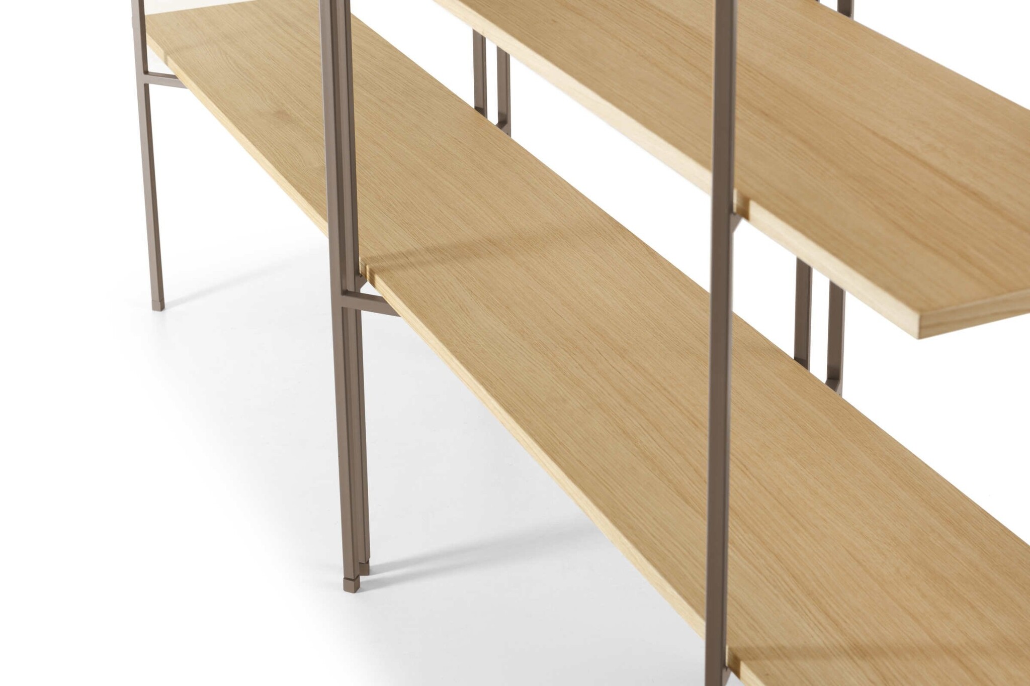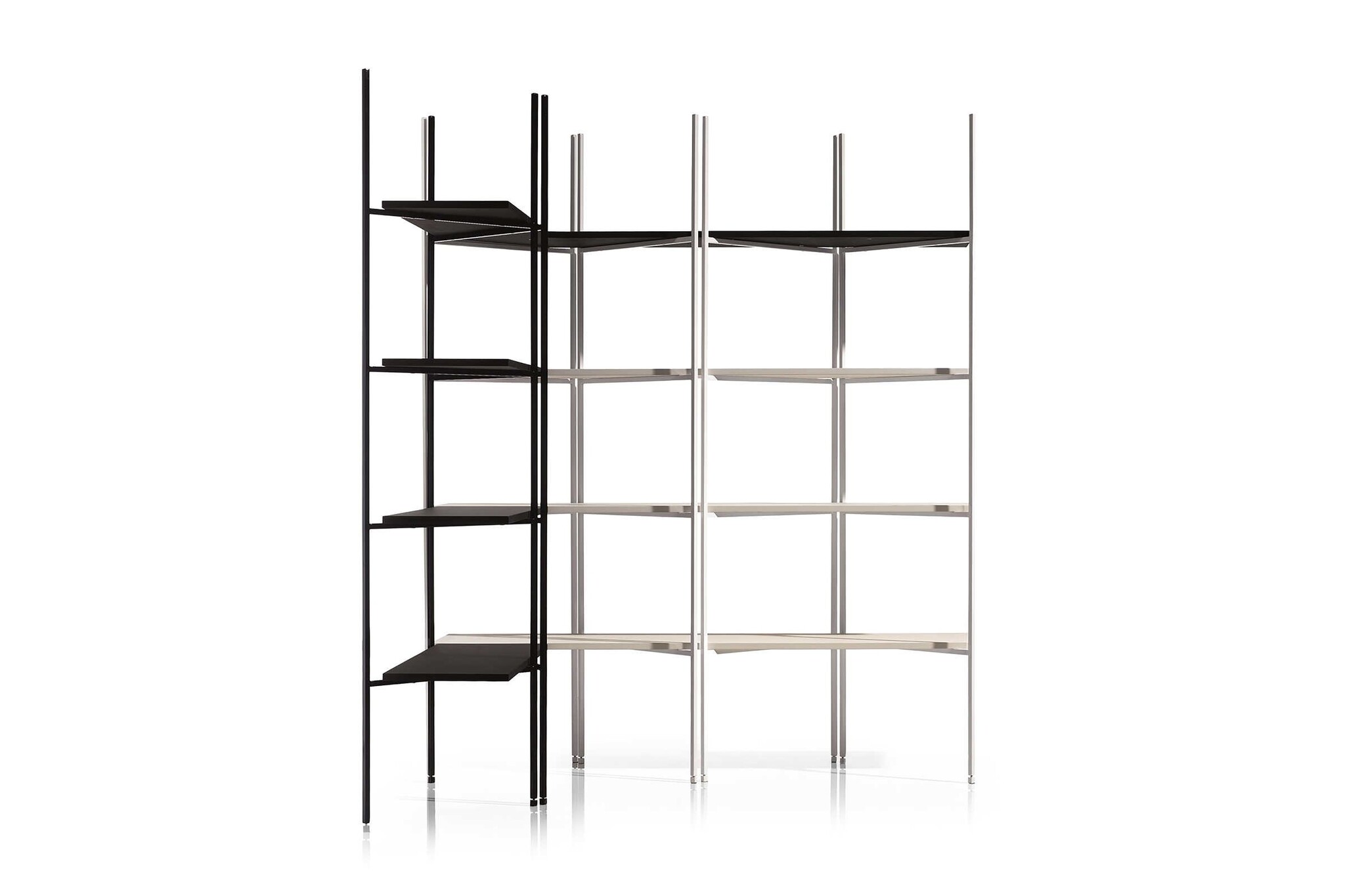 Met een eenvoudige verschuiving in de montage van de planken zijn er verschillende mogelijke configuraties beschikbaar, verschillend in vorm en afmetingen: lineair, op een hoek of kruisvormig. Het frame is gemaakt van glanzend staal, verkrijgbaar in vele kleuren en is te combineren met de mdf-planken die verkrijgbaar zijn met verschillende fineeropties.
