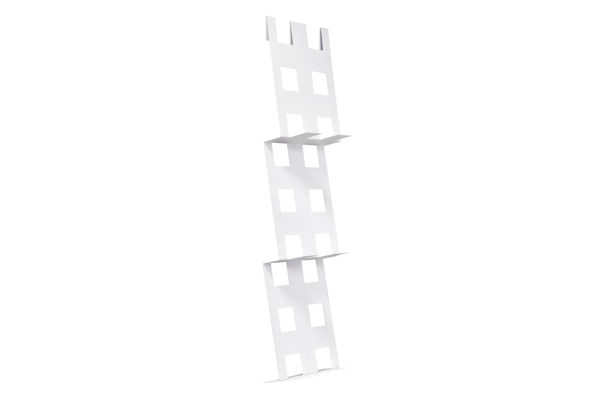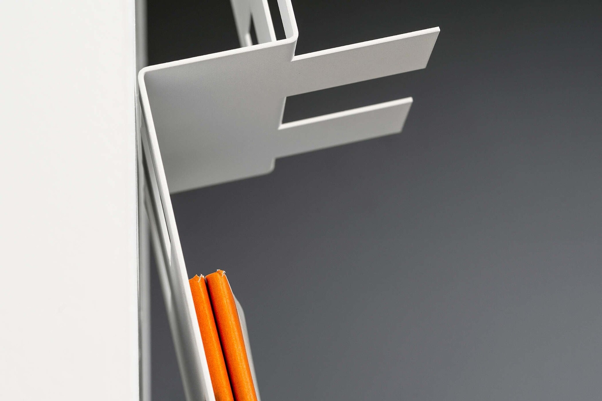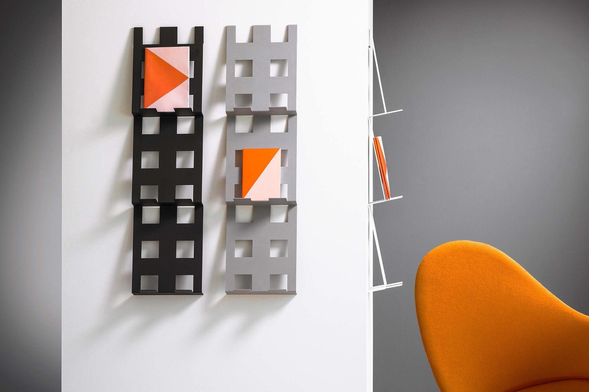 Het frame en de brochurehouders zijn leverbaar in zwart (van Esch 9311), metallicgrijs (van Esch 9306) of wit (van Esch 9310) structuurlak geëpoxeerd staal.