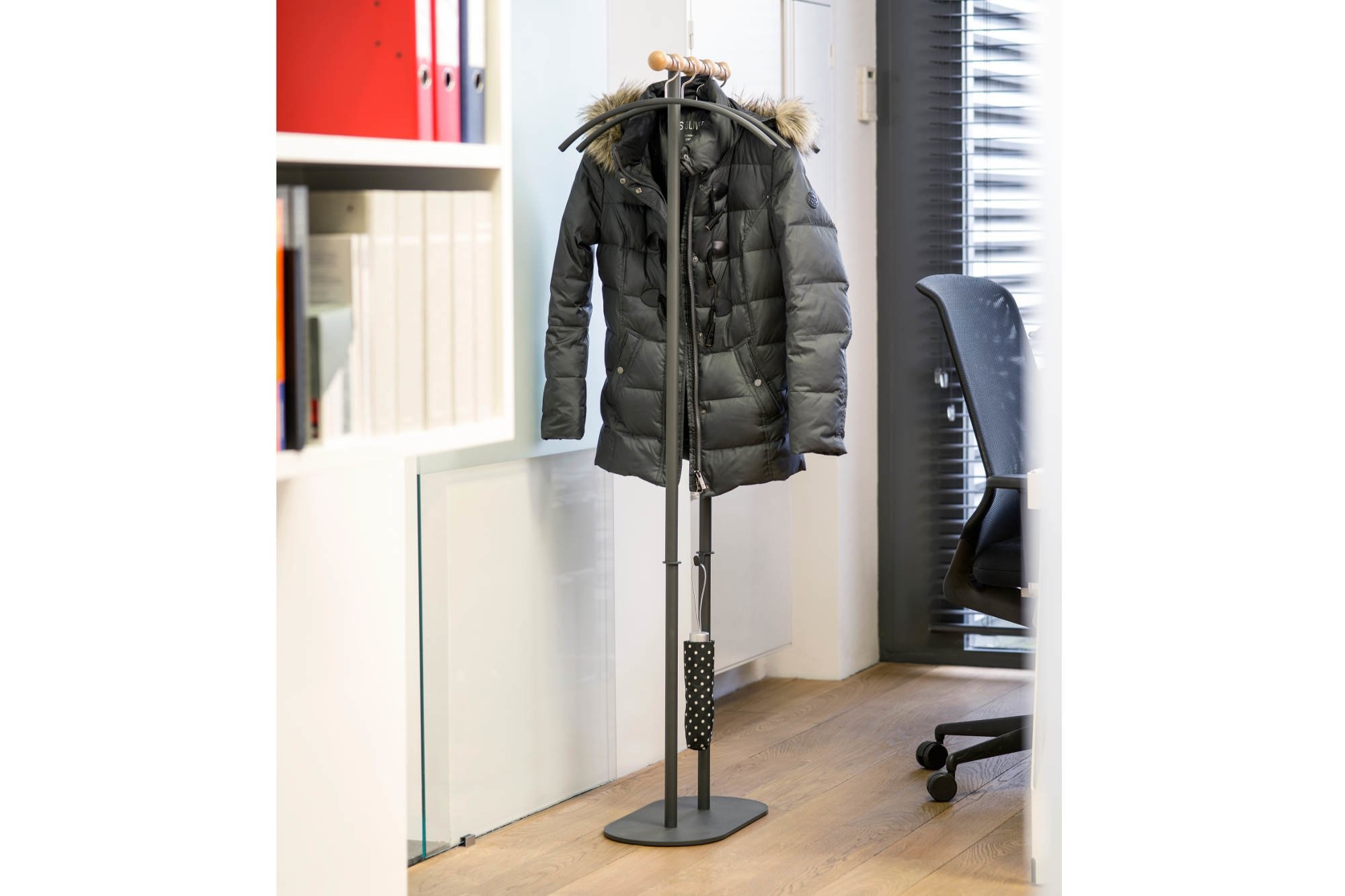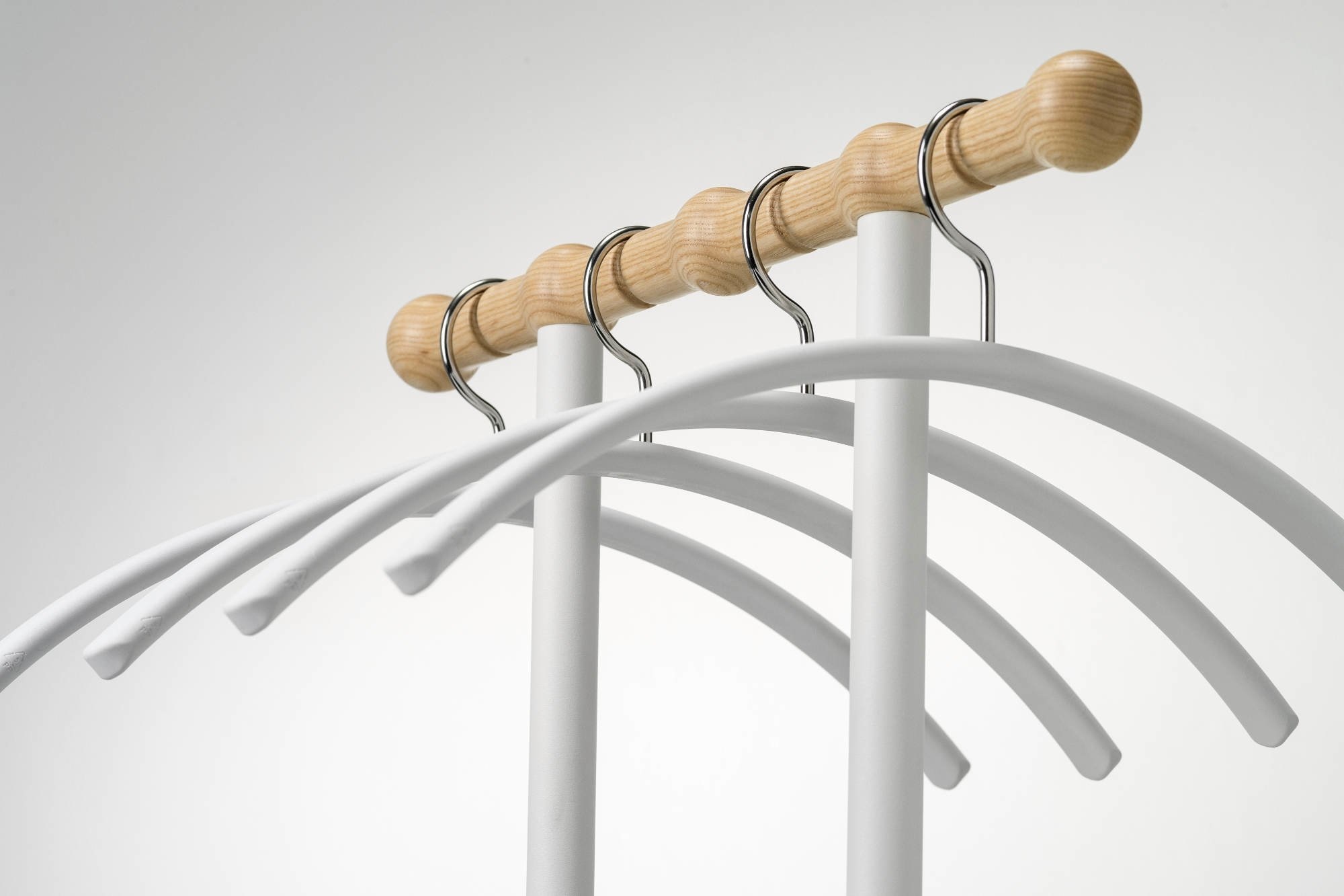 De Philippe van Van Esch is één van de praktische en elegante kapstokken uit de collectie. Ontwerper Christoph Seyferth heeft dit model fraai vormgegeven en heeft een sierlijke houder voor de kledinghangers ontworpen. Deze houten houder met ingefreesde groeven houdt de kledinghangers op afstand van elkaar. Kledinghangers (Tubulus 100) worden standaard bijgeleverd. Ook heeft de Philippe een extra haakje, hier kunnen sleutels, een handtas of andere benodigdheden gemakkelijk opgehangen worden. Dit model is staande kapstok welke 4 kledinghangers en twee extra haakjes bezit. Een gestroomlijnd model. De voet, kolom, ring en haak zijn in donkergrijs of wit verkrijgbaar, afgewerkt met structuurlak en gemaakt van geëpoxeerd staal. Het bovendeel is gemaakt van naturel essen, wat gelakt is.