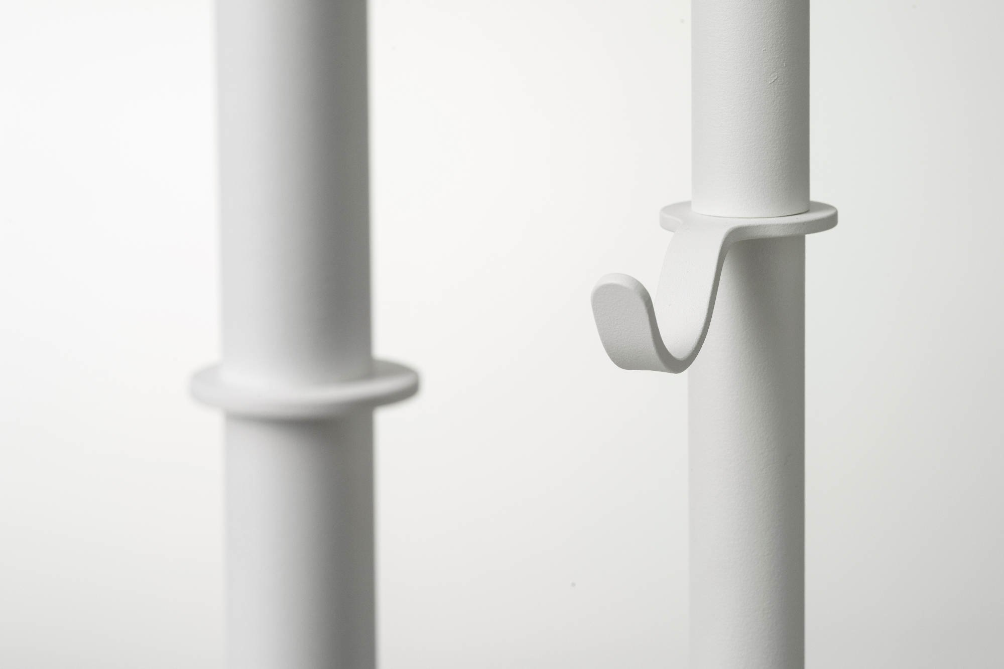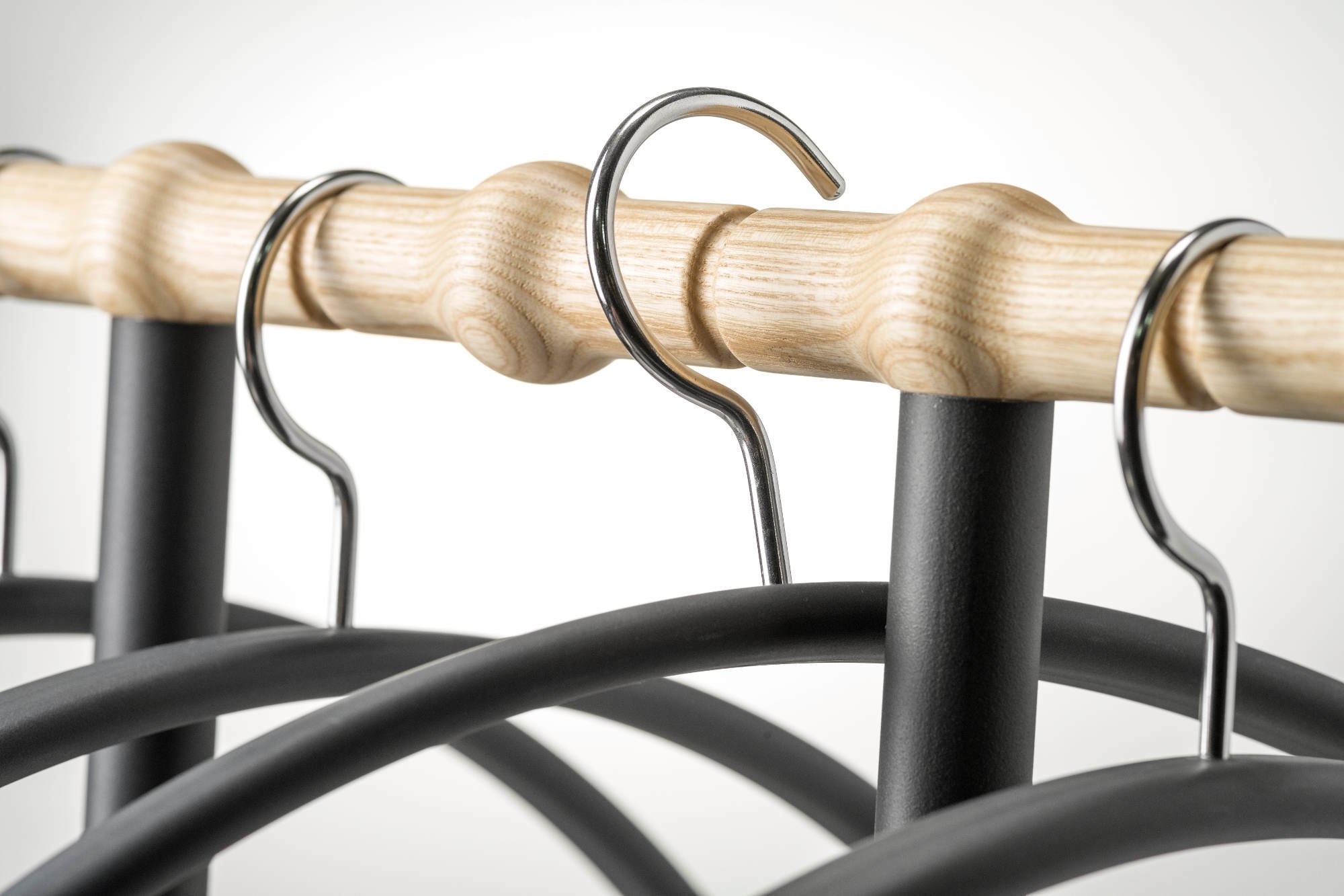 De bijgeleverde Tubulus 100 kledinghangers in donkergrijs of wit kunststof, haak is van RVS.