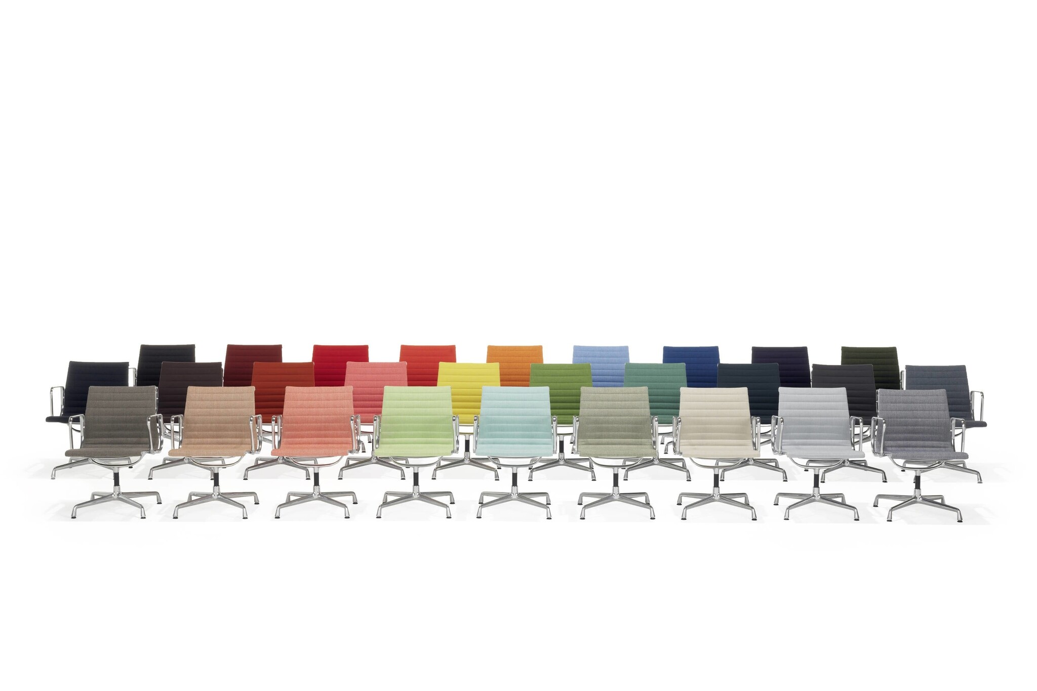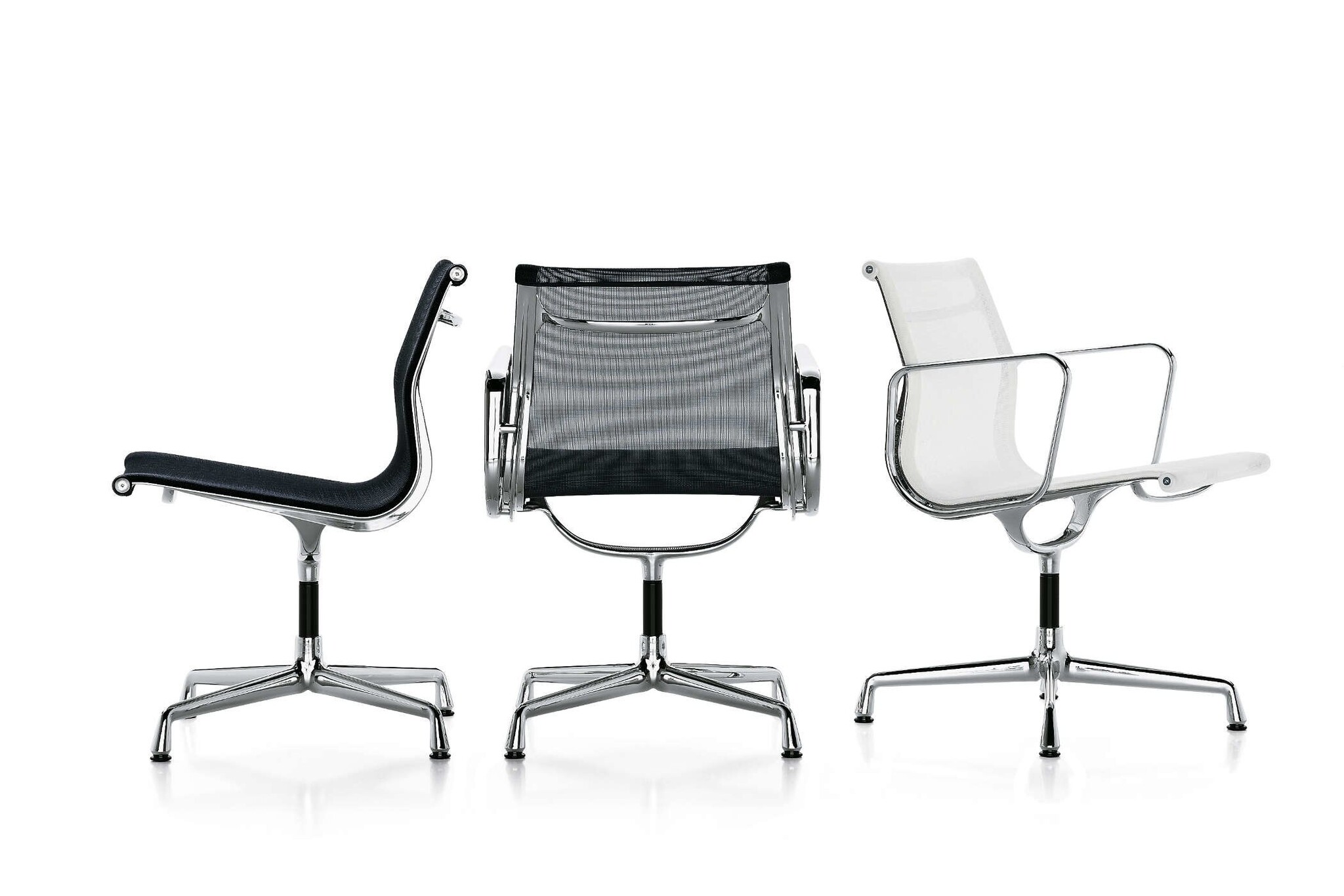 Vitra Aluminium Group stoelen en fauteuils met middelhoge en hoge rugleuning, met of zonder armleuningen, naar keuze met lederen opleggers. Zijprofielen, spanbeugel, armleuningen en onderstel van drukgietaluminium, gepolijst of verchroomd. Bekleding hoogfrequent gelast, overtrek Hopsak (100% polyamide), netweefsel (met kunststof ommanteld polyestergaren) of nappa rundleder.Onderstelvarianten: viersteronderstel, draaibaar of niet draaibaar, met glijders voor zachte of harde vloeren.