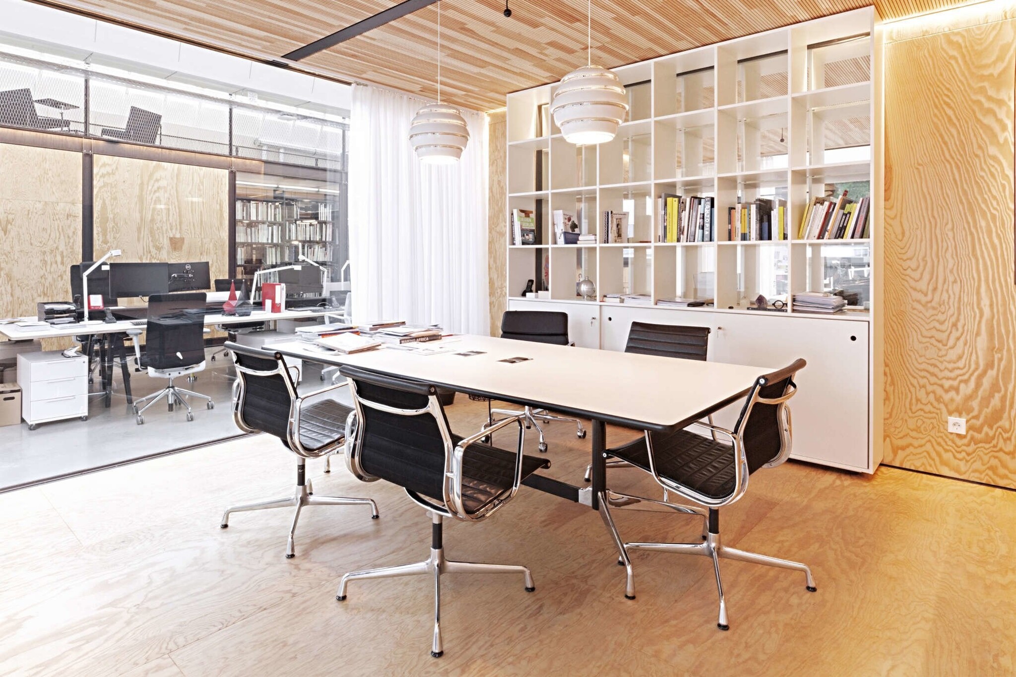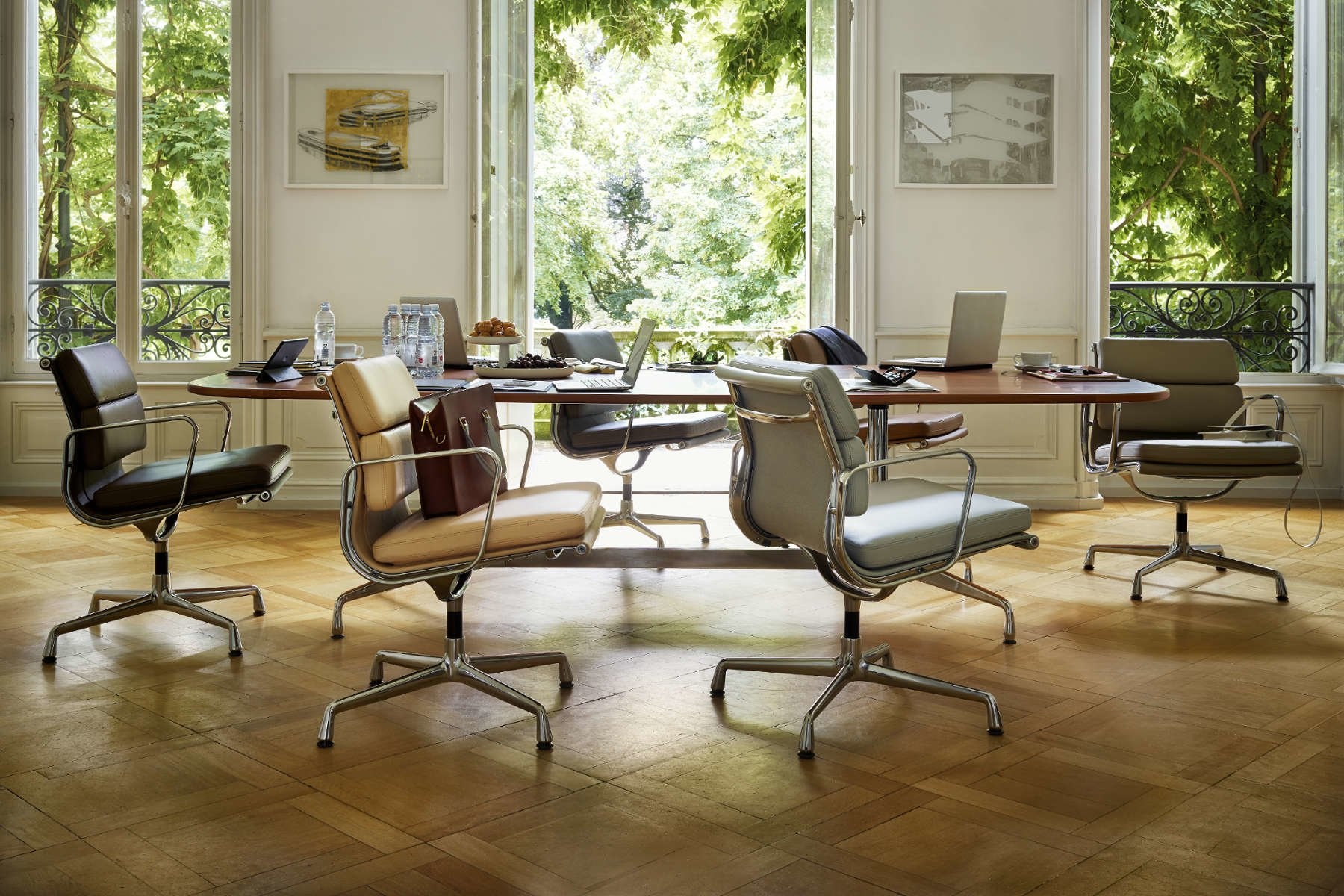 Deze Vitra Eames Segmented Tables passen daar goed in en zijn in te zetten als vergadertafel, maar als je even wat mailtjes wilt beantwoorden op je laptop, dan kun je ook even aanschuiven aan deze tafel.