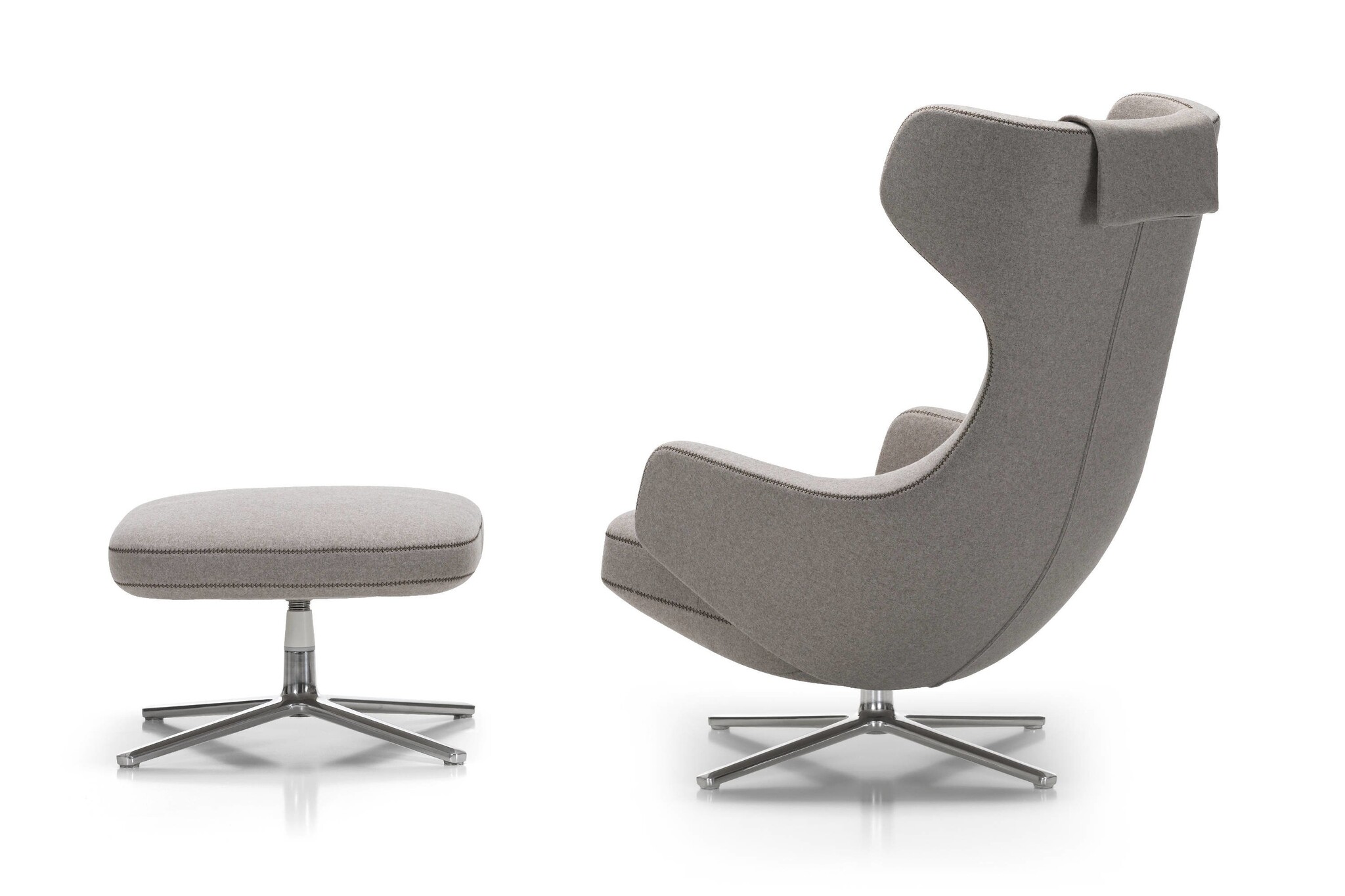 Het is een draaibare lounge fauteuil met een kunststofframe en polyurethaanvormschuim. De Grand Repos is in verschillende kwaliteiten leder en stof verkrijgbaar. De siernaden geven de Vitra Grand Repos lounge chair een hedendaagse uitstraling. Het onderstel is van persgietaluminium en is te verkrijgen in een gepolijste uitvoering of met een poedercoating.