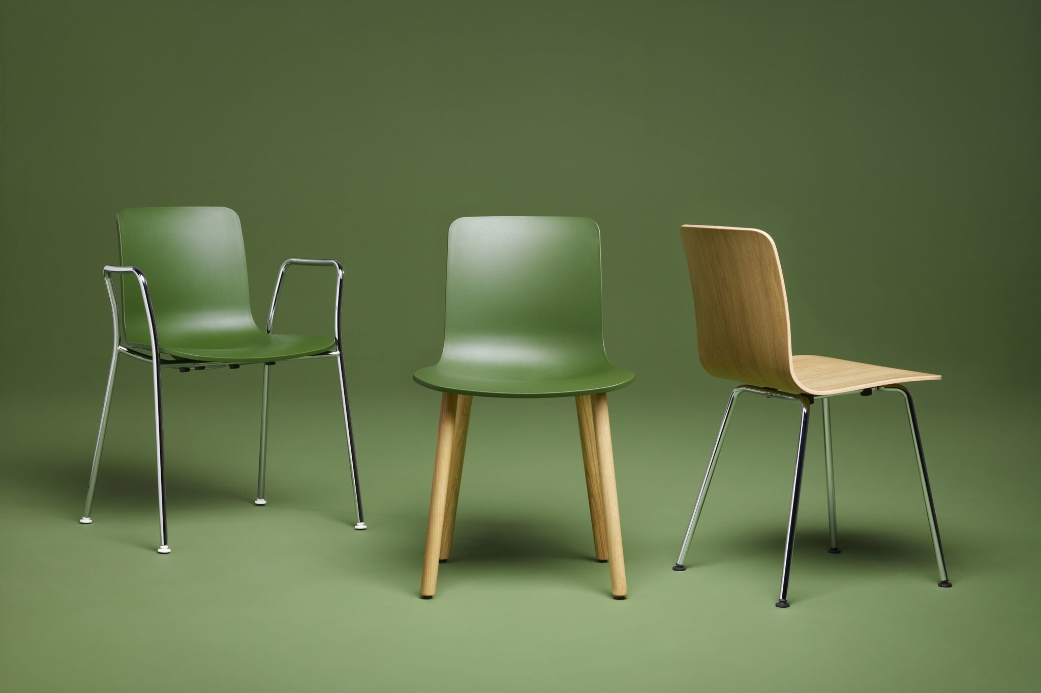 De zitschaal van de stoel is door en door gekleurd polypropyleen of multiplex.