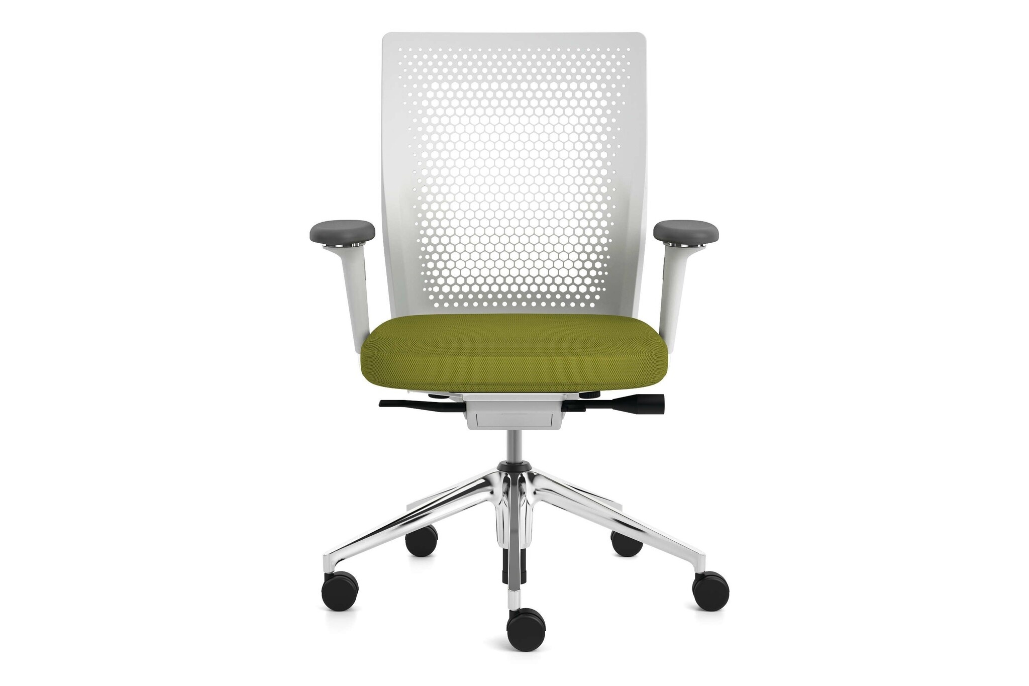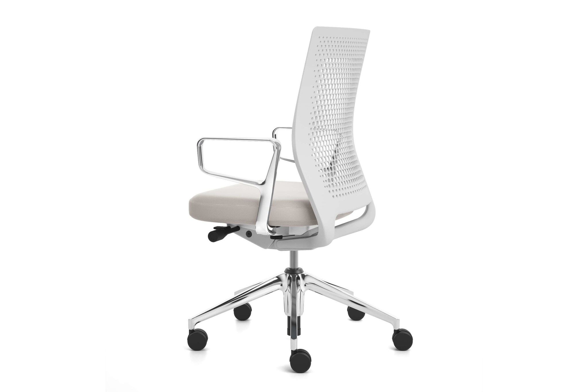 De Vitra ID Air bureaustoel heeft een eenvoudige constructie, maar biedt optimaal zitcomfort. De stoel heeft een flexibele rugleuning van kunststof met een gaatjespatroon. Vandaar de naam Air. De rugleuning is onderhoudsvriendelijk en garandeert een aangename luchtcirculatie. Deze bureaustoel is ideaal toe te passen in kantoren voor langdurige werkzaamheden aan een bureau. Hij biedt namelijk langdurig ondersteuning voor een gezonde zithouding en voorkomt hiermee lichamelijke klachten. Vitra ID Air met Clima Seat