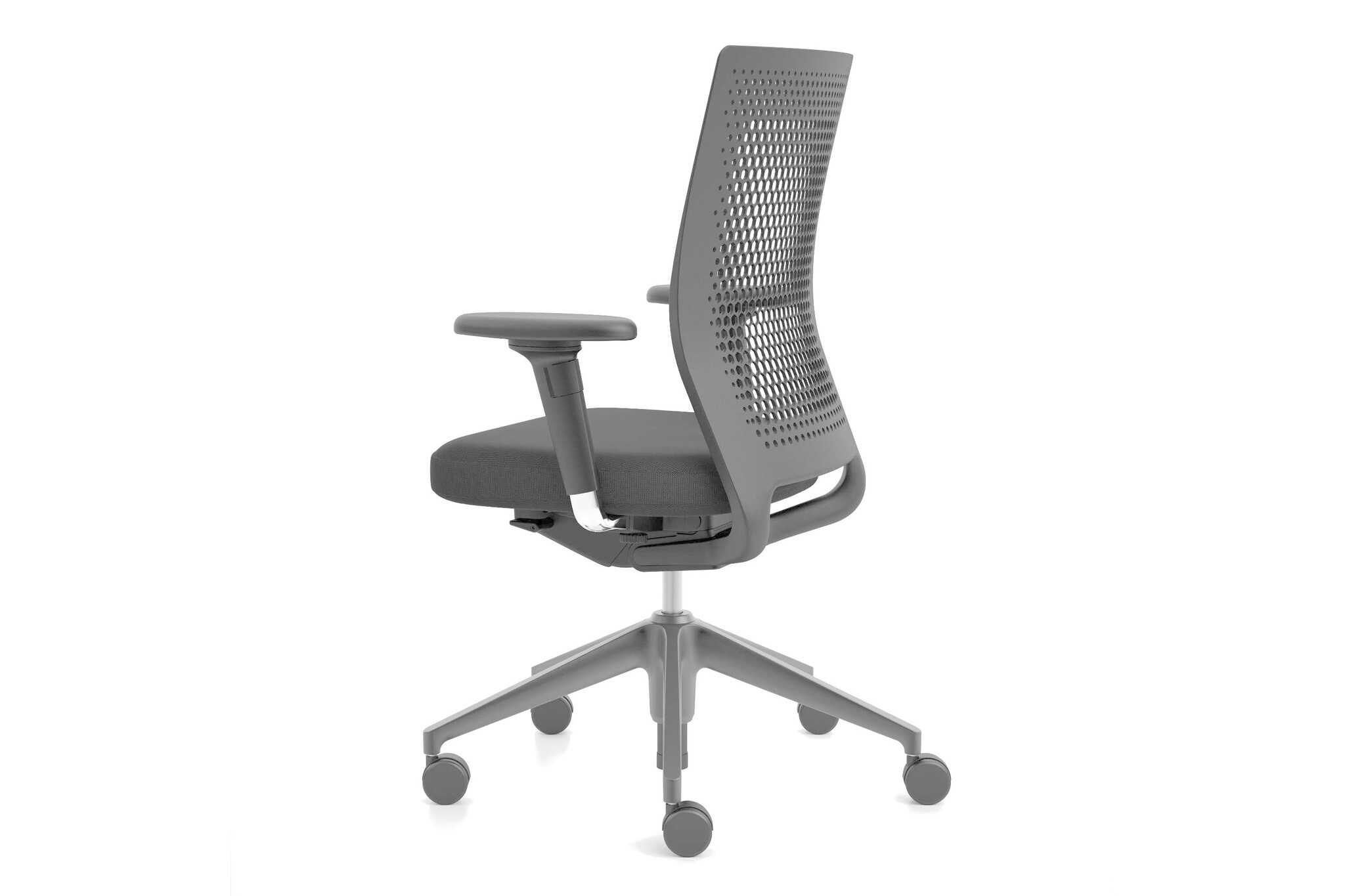 De kunststof rugleuning van opengewerkt polypropyleen is leverbaar in basic dark, soft grey of soft light.