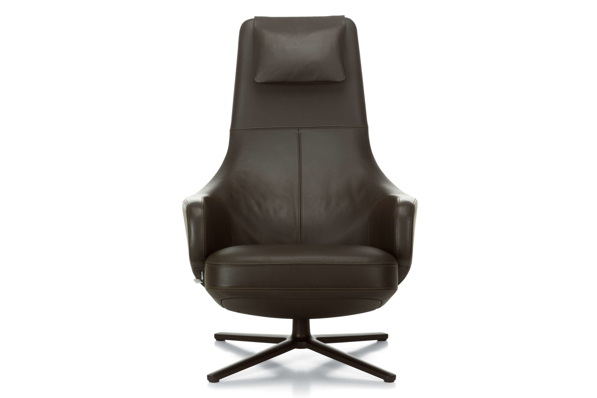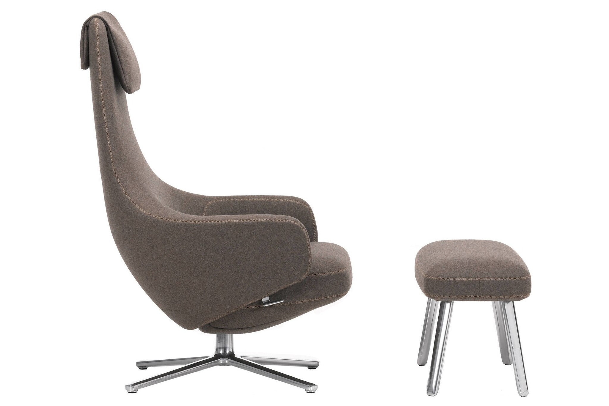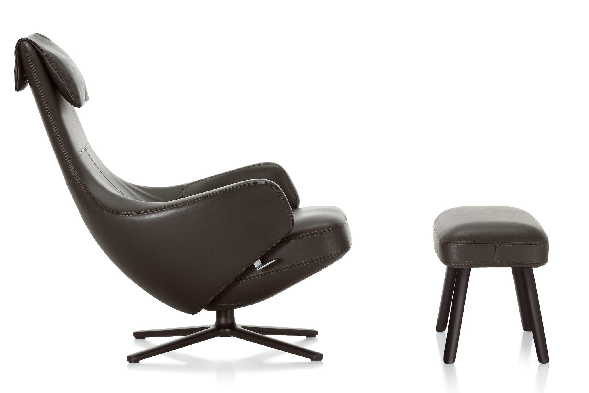 Vitra Repos is een draaibare lounge fauteuil met een kunststofframe en polyurethaanvormschuim. De Grand Repos is in verschillende kwaliteiten leder en stof verkrijgbaar. De siernaden geven de Grand Repos fauteuil een hedendaagse uitstraling. Het onderstel is van persgietaluminium en is te verkrijgen in een gepolijste uitvoering of met een poedercoating.