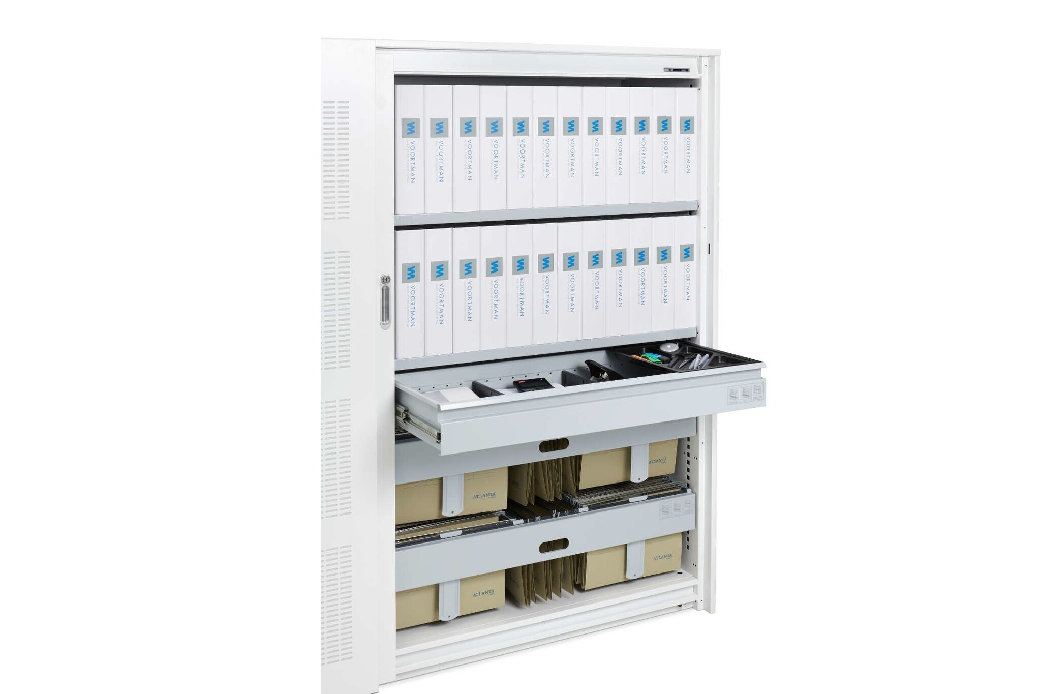 Roldeurkasten zijn veelzijdig toepasbaar, als functioneel opbergmeubel en voor een optimale invulling van de ruimte. De maatvoering en de eventuele afwerking met een topblad worden afgestemd op de plaats van deze meubelen in de ruimte. De Voortman roldeurkasten kunnen naar wens uitgevoerd worden met stalen, dan wel kunststof roldeuren. Roldeurkasten met stalen lameldeuren zijn door de strakke vormgeving en keuzevrijheid in lakafwerking optimaal in te passen in de stijl en kleurstelling van het kantoor.