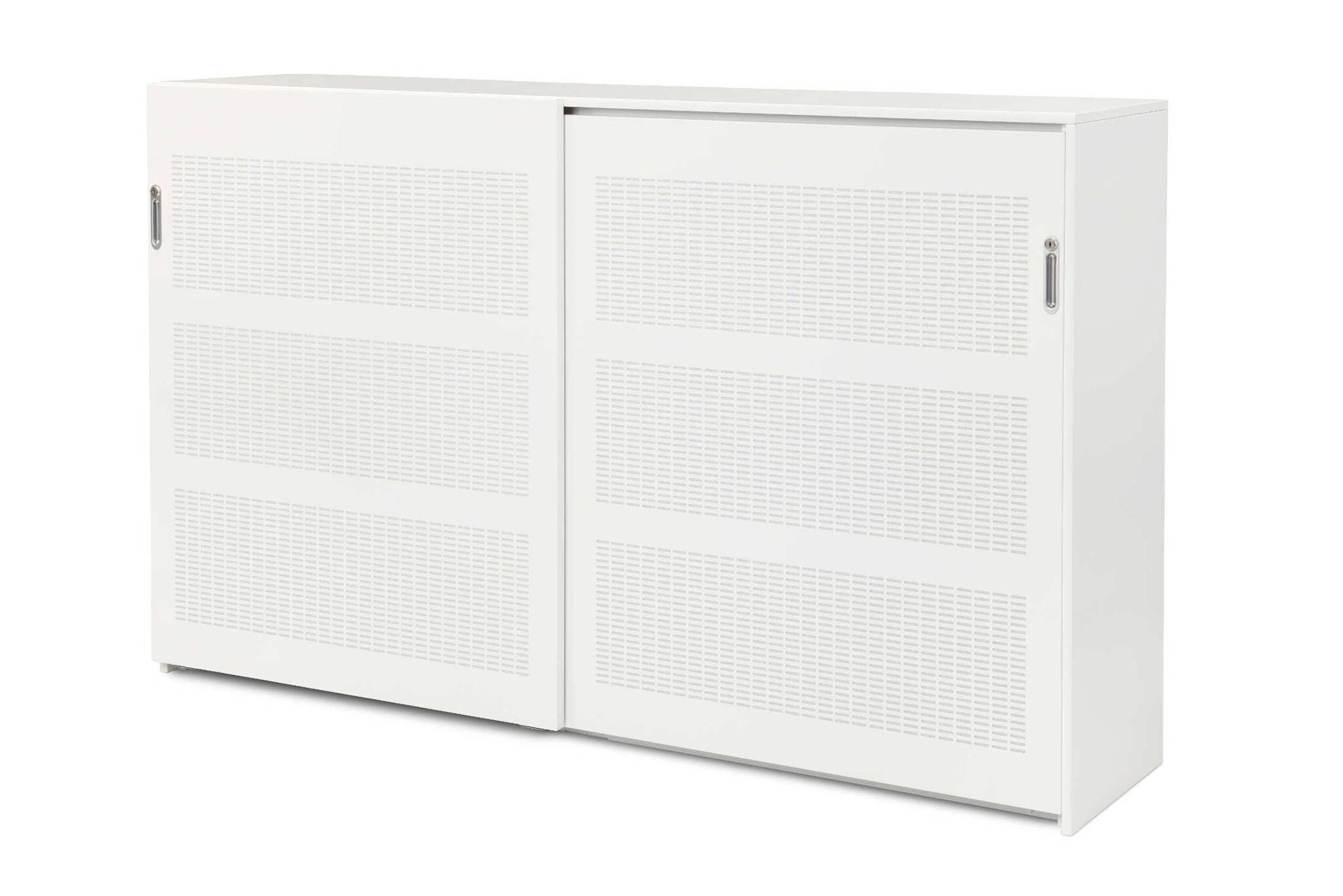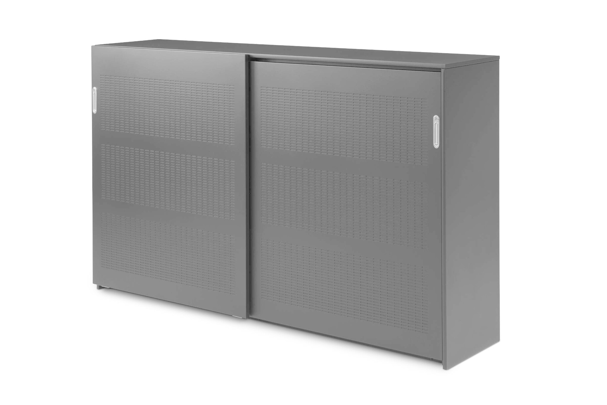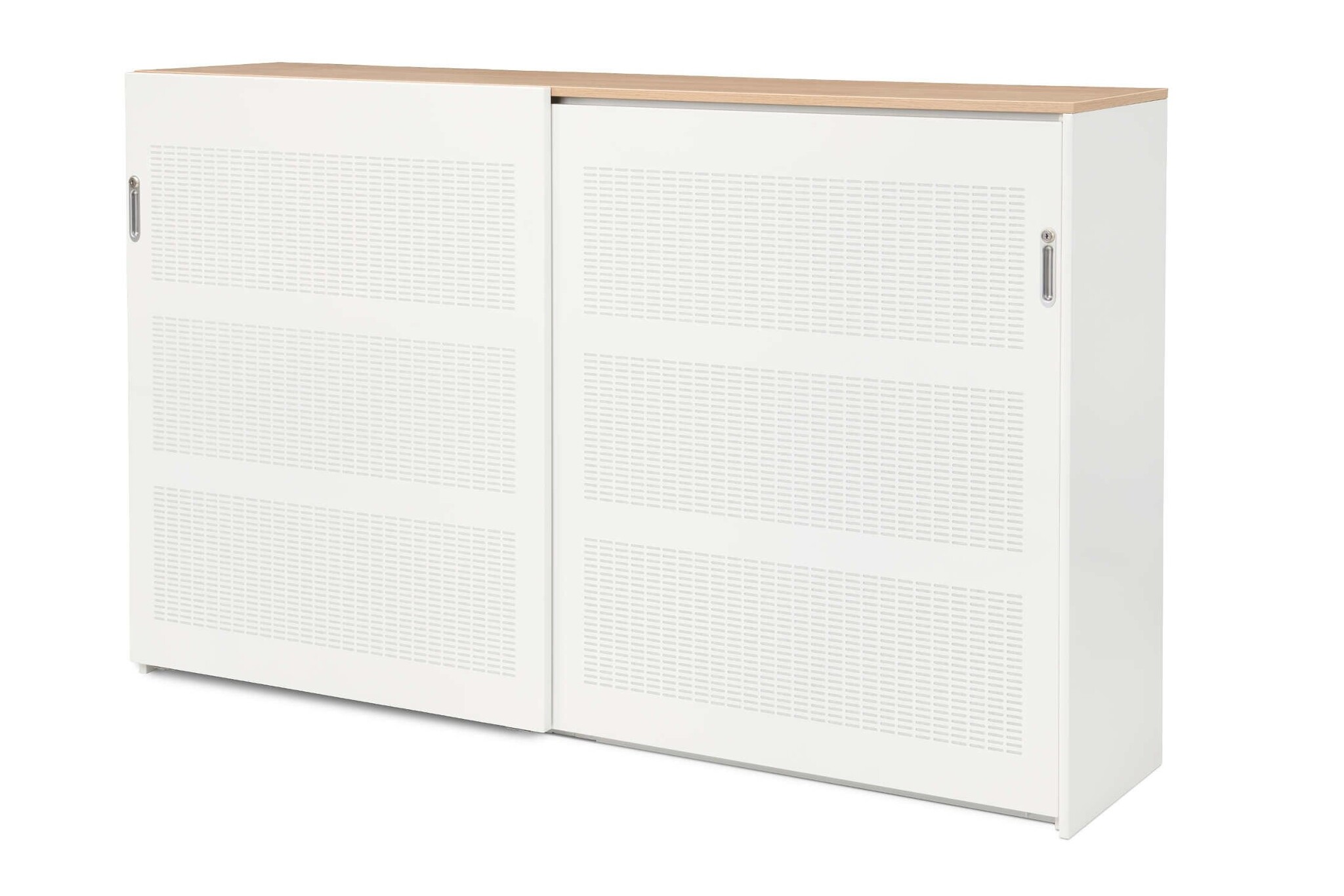 De akoestische schuifdeurkast heeft een zeer degelijke constructie, bestaande uit een gelaste romp, en twee schuifdeuren opgehangen in een railsysteem met wielgeleiding. De rechter deur is voorzien van een doorlopende handgreep, de schuifdeuren zijn voorzien van een rechthoekig perforatiepatroon.