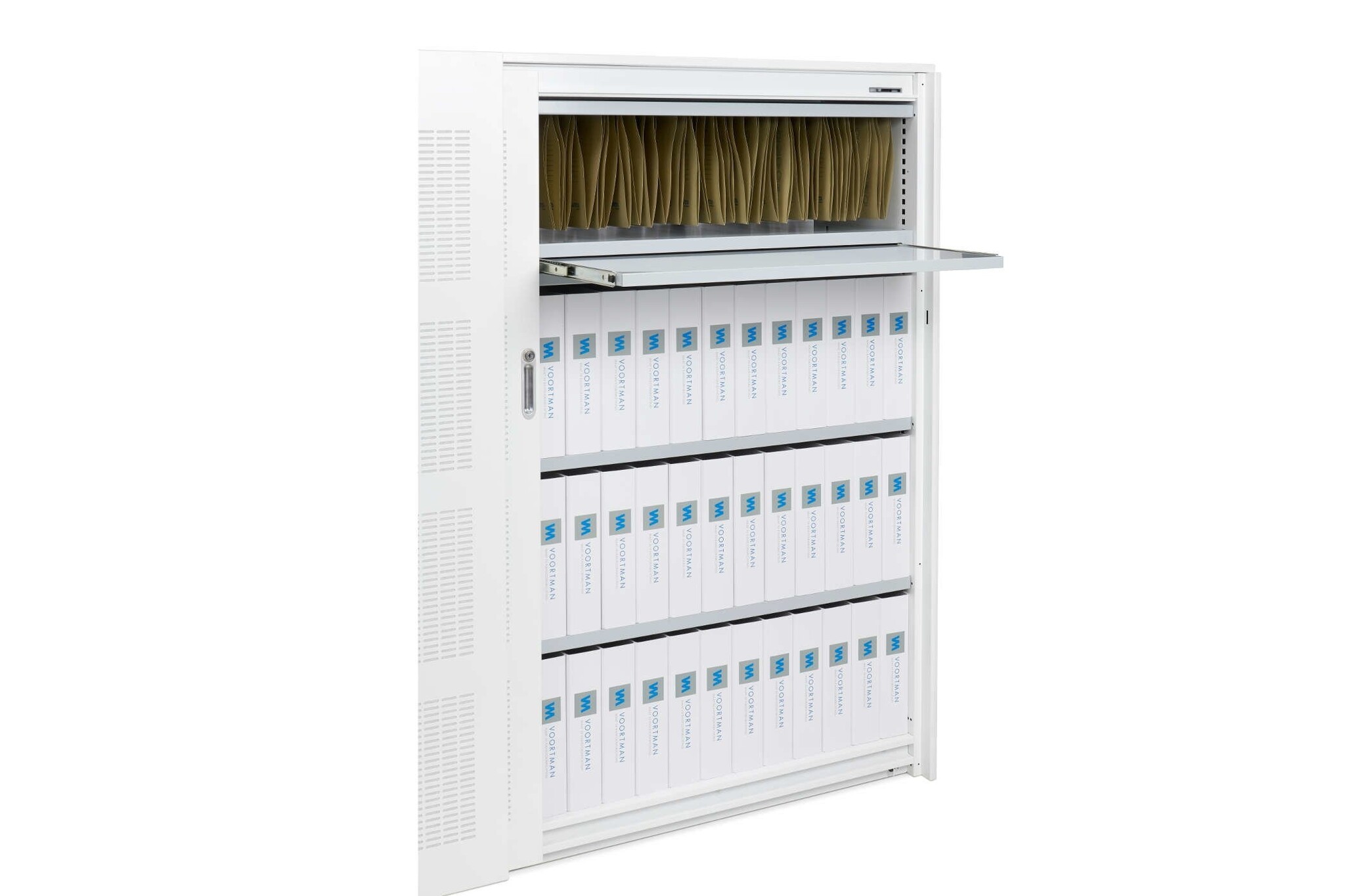 In de deuren is een geluidsabsorberend polyesterwol verwerkt dat word afgedekt met een vuilafstotend, brandwerend vliesdoek. Kast is optioneel te voorzien van een akoestische achterwand. De kast is afsluitbaar door een slot in de linker deur. Slot is voorzien van 2 klapsleutels. Kasten zijn van binnenuit stelbaar met justeervoeten.