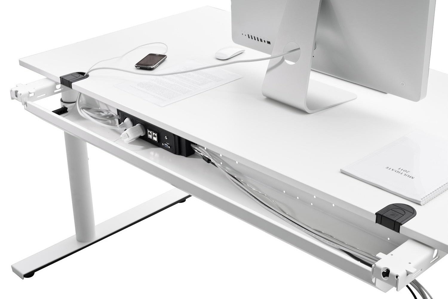 Toebehoren: Kabeldoorvoer hoekig, of rond / kabelkanaal staal, aan beide zijden neerklapbaar / PC-houder / kabelslang verticaal / frontscherm geperforeerd staal.