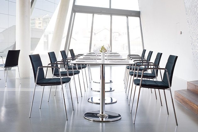 Wiesner Hager Macao bistrotafelprogramma biedt een uiteenlopende keus in kolomtafels voor het ontspanningsbereik. Er kan worden gekozen uit tafels met een vierkant en rond blad in alle gangbare formaten en twee vrije-vorm tafels met asymmetrisch blad. Met drie tafelhoogtes bestrijkt macao alle toepassingsgebieden - van de lage bijzettafel via de tafel met standaardhoogte 72 cm tot de statafel. Voor de tafelbladen kan worden gekozen uit vele verschillende uitvoeringen:melamine, HPL, houtfineer, volkern en bij bepaalde formaten in helder glas.