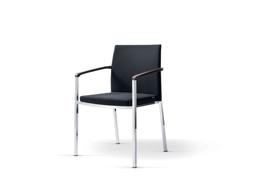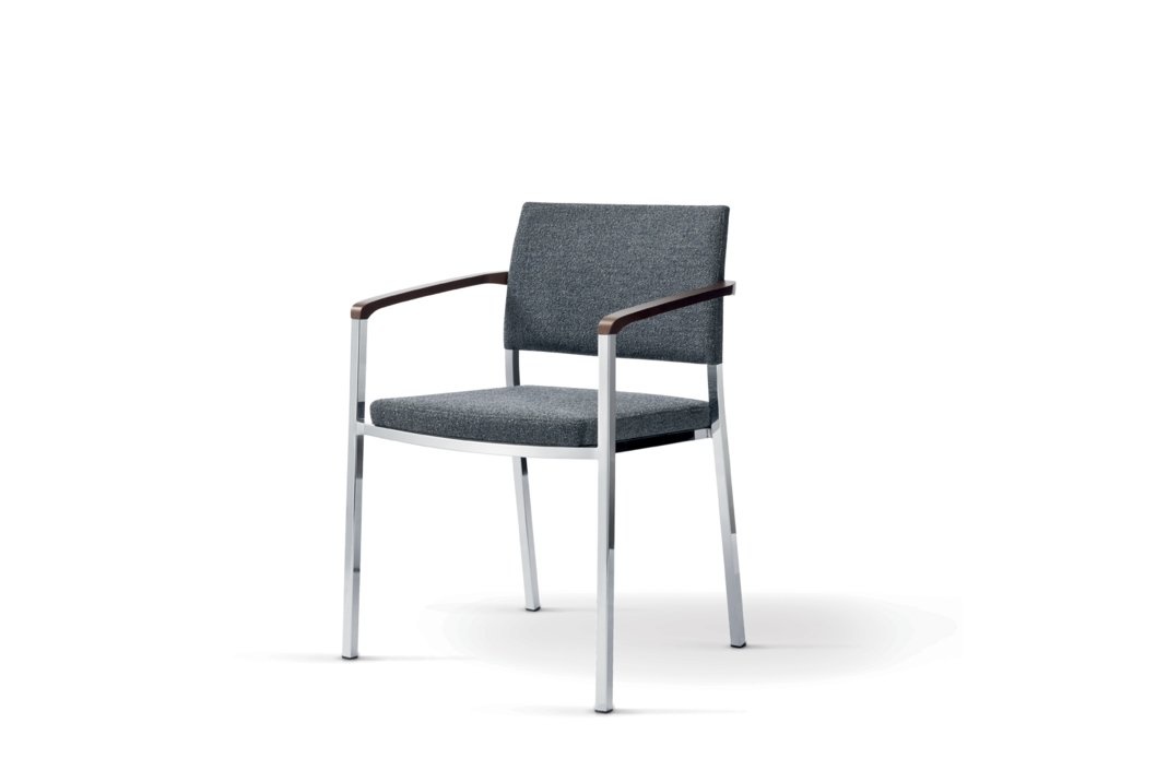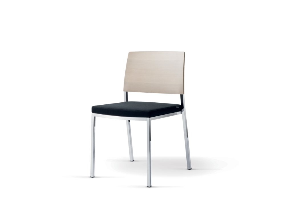 Frame van stalen precisiebuis, kunststof glijders. Zitting met elastische bespanning. Stapelschaal kunststof zwart. Massief houten armleggers, naar keuze beuken, essen of eiken. Houten oppervlakken gebeitst, metalen oppervlakken met poedercoating.