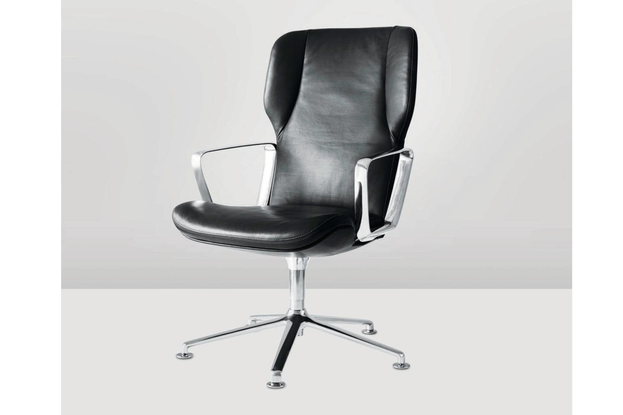 Onderstel is 5-poots (stervoet) in gegoten aluminium, helder verchroomd, mat gepolijst en gecoat in zwart of wit met een gestructureerde matte afwerking.
