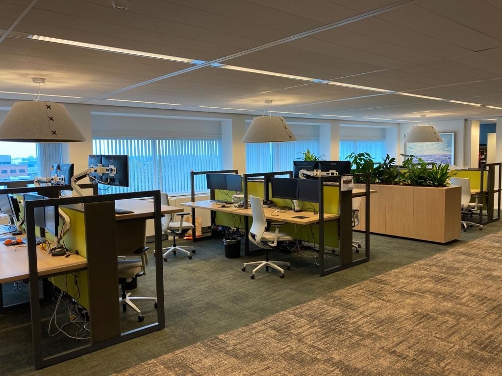 Totaalinrichting 60 werkplekken Interieurontwerp Zit-sta werkplekken Projectvloeren: PVC en tapijt Concentratieplekken Verlichting Vergaderruimtes Akoestische panelen