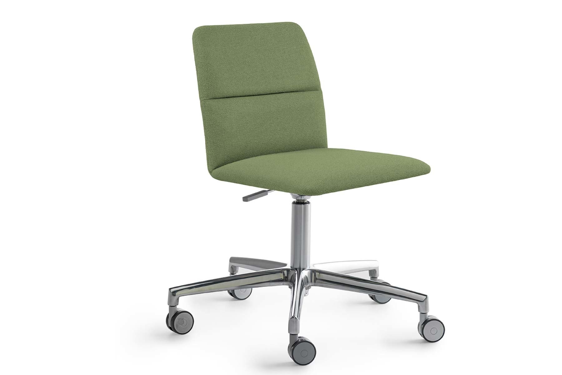 De Crassevig Aura stoel is verkrijgbaar met 4 eikenhouten poten, met gepoedercoat aluminium of in hoogste verstelbare draaivoet met 5 zwenkwielen.