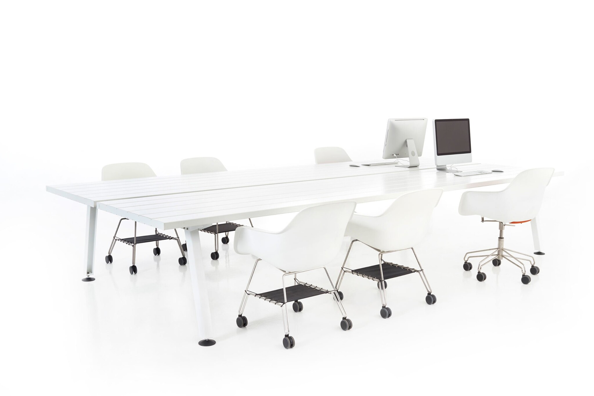 Het showroomexemplaar van de Marina-tafel op het Salone Internazionale del Mobile was ongeveer 12 meter lang, maar je kunt het meubelstuk ook verkrijgen in 'normale' afmetingen (vanaf 2m20). Het was voor Extremis een uitdaging om een ontwerp te maken dat qua budget toegankelijk is voor velen, zonder dat de functionaliteit en designwaarde er moesten bij inschieten. Het feit dat je - dankzij de banken - niet genoodzaakt bent alle stoelen apart te kopen voor aan tafel, spaart al meteen heel wat geld uit.