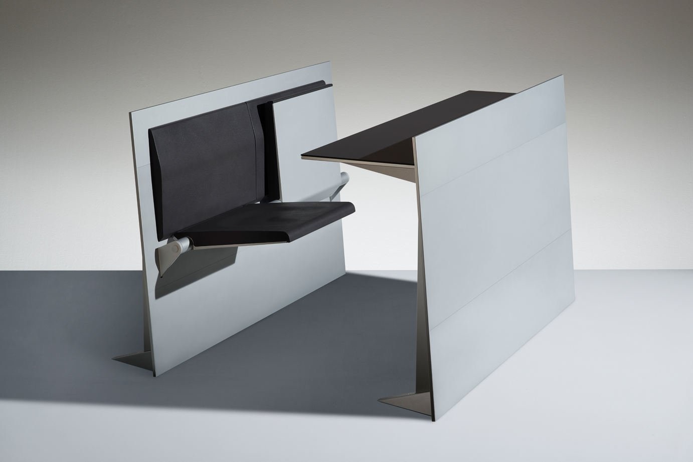 De toplaag van de tafel en stoel van het Lamm Blade system bestaat uit een krasvrije HPL-laag.