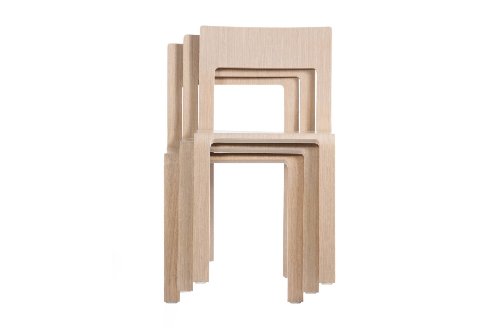 De stoelen zijn volledig van hout of leverbaar met een gestoffeerde zitting. De standaard beitskleuren zijn wengé, noten en zwart. Speciale kleuren zijn op aanvraag.
