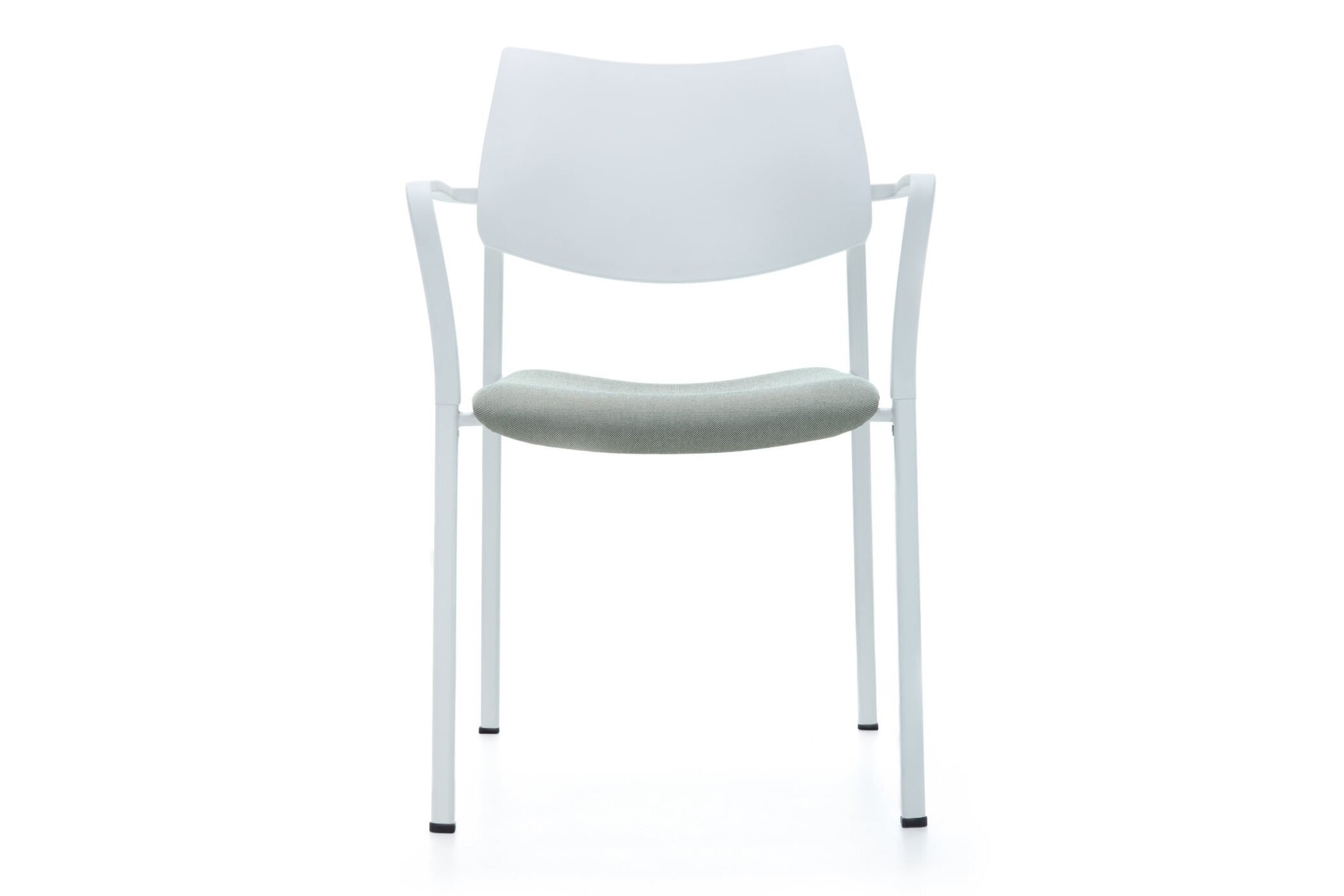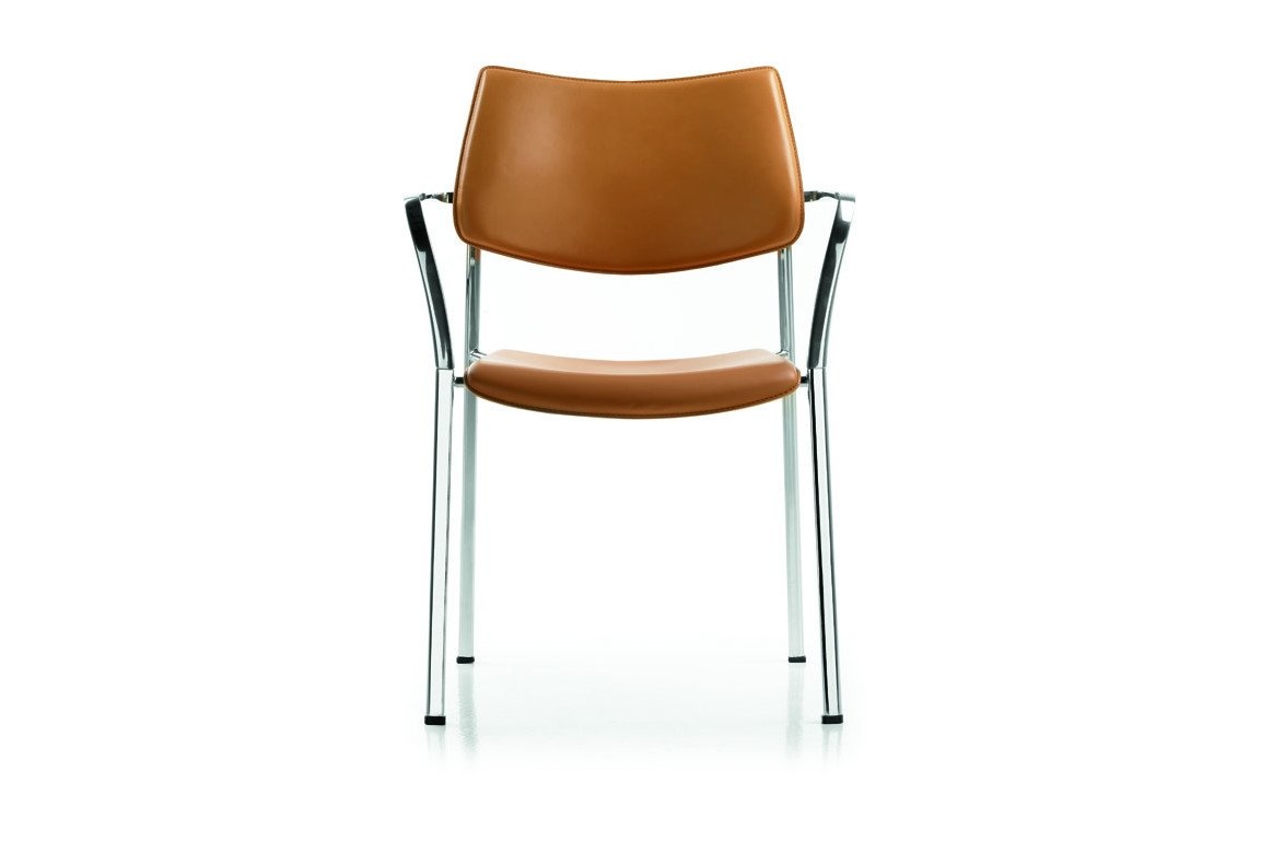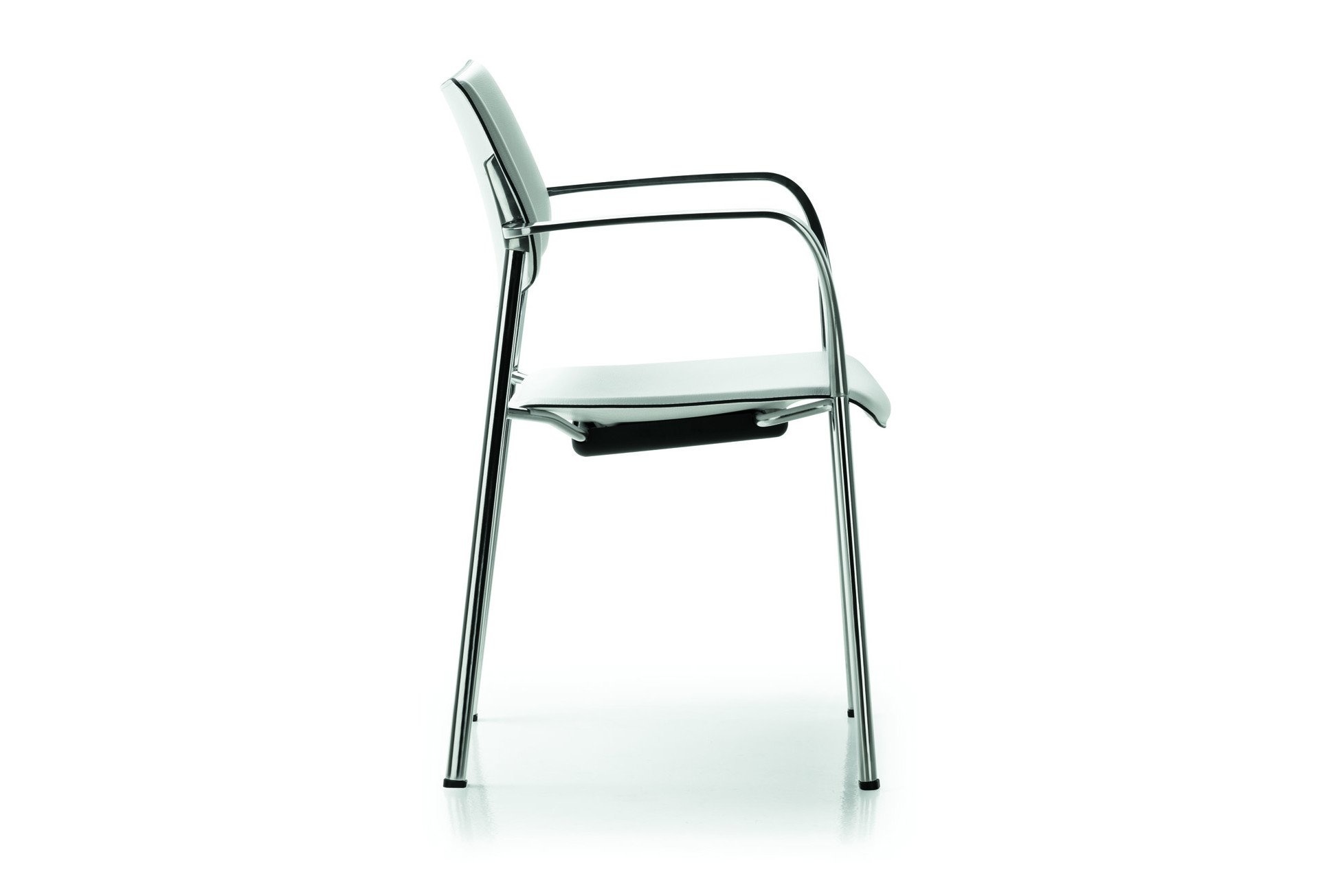 Stapelbare stoel met of zonder armleuningen. Het frame is gemaakt van gepoedercoat staal. Een optie is om deze verchroomd te maken. De zitting en rug is gestoffeerd in stof of zacht leer. De armleuningen zijn gemaakt van polyamide of gepoedercoated aluminium of gepolijst.