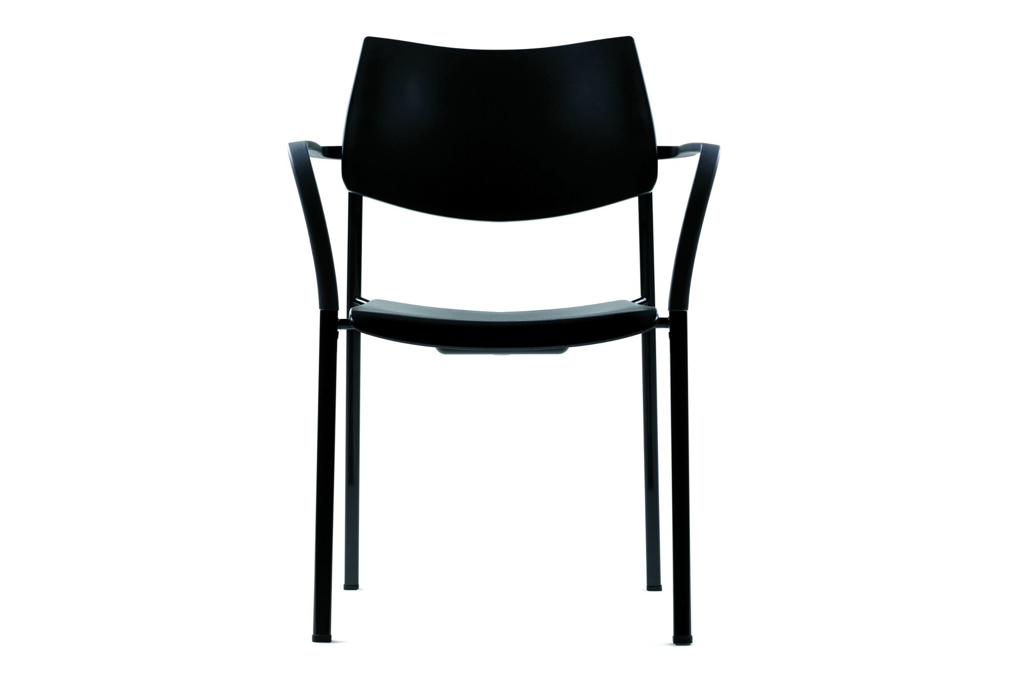 Stapelbare stoel met of zonder armleuningen. Het frame is gemaakt van gepoedercoat staal of verchroomd. Zitting en rug zijn gegoten van gefineerd (multiplex). De armleuningen zijn gemaakt van polyamide of gepoedercoated aluminium of gepolijst.