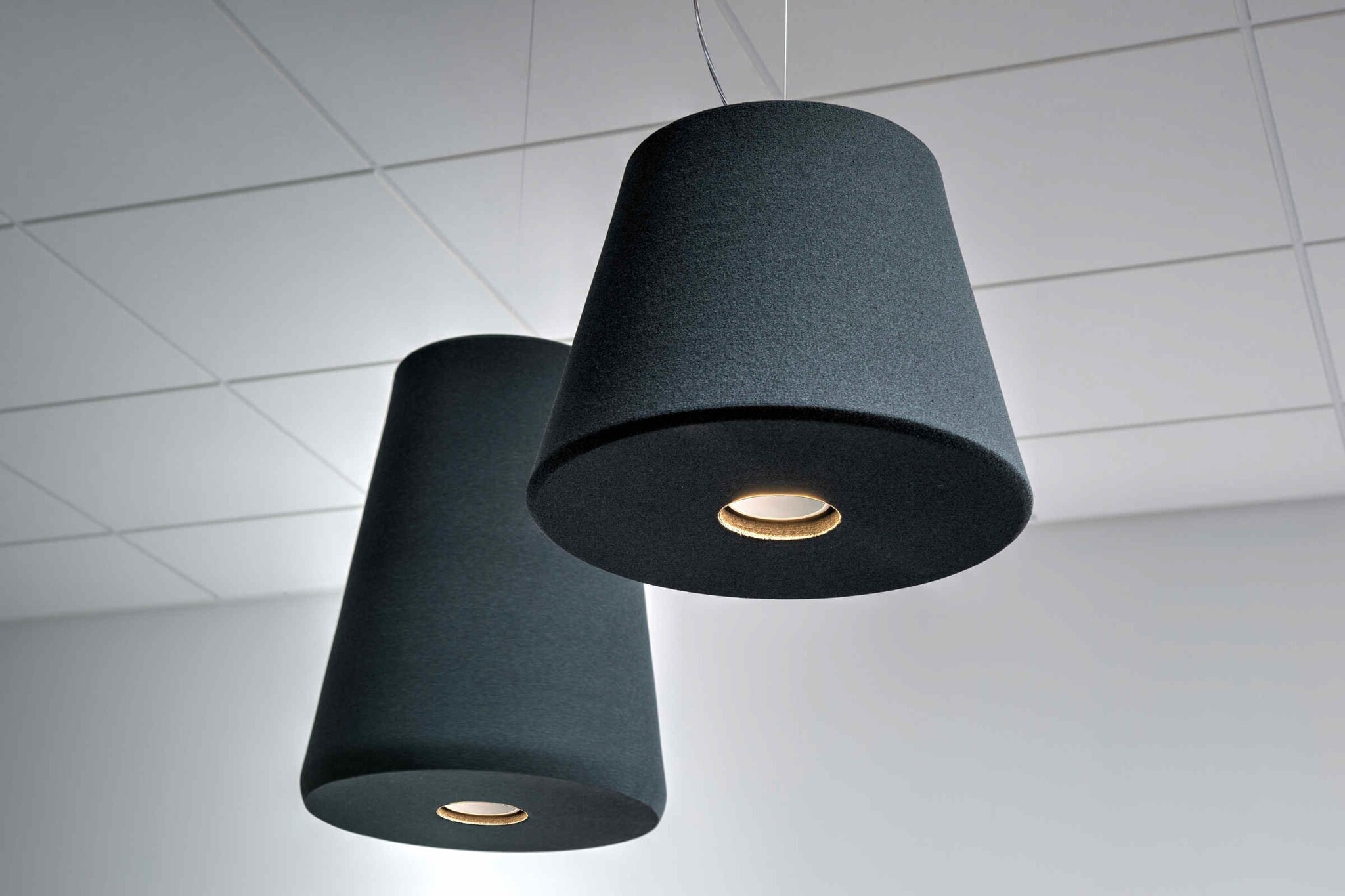 De Akomo Cup is akoestische verlichting. Deze akoestische pendel geeft LED downlight (schijnt naar beneden) en is ideaal toepasbaar in ruimtes waarbij naast verlichting ook een akoestische oplossing gewenst is om geluidsoverlast te beperken. Je kunt denken aan het bedrijfsrestaurant of andere horecagelegenheden, maar ook aan vergaderruimtes, lounges of lobby’s. De Akomo Cup heeft een geluiddempende werking en is leverbaar in maar liefst 12 verschillende kleuren en 2 verschillende hoogtematen (300 en 500 mm). Zo past er altijd wel een Akomo Cup in uw kantoorinrichting.