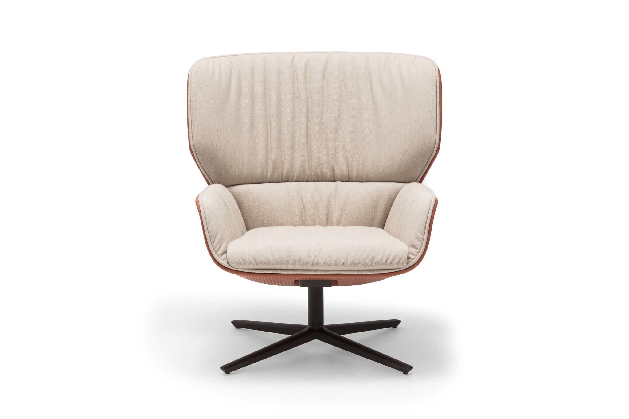 BU2742: Fauteuil met kruisvoet onderstel, voorzien van een centrale draaivoet met retoursysteem en verkrijgbaar in gepolijst aluminium, witte of zwarte afwerking.
