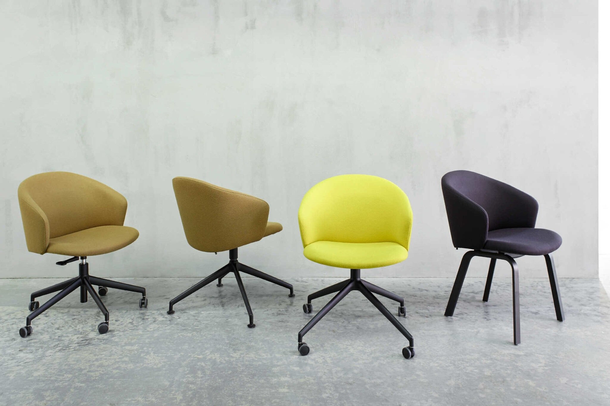 Onderstel: 4 teens centrale voet (draaibaar) op pootjes: gepolijst aluminium, epoxylak op aluminium, epoxy fine texture op aluminium of houten 4-poot (beuken laminaat met eiken toplaag).