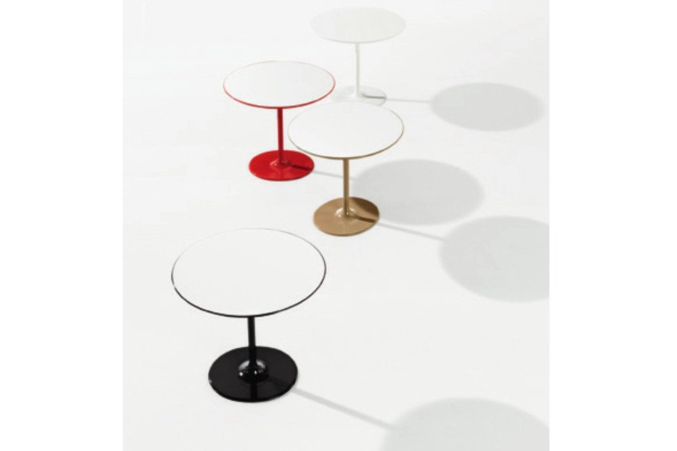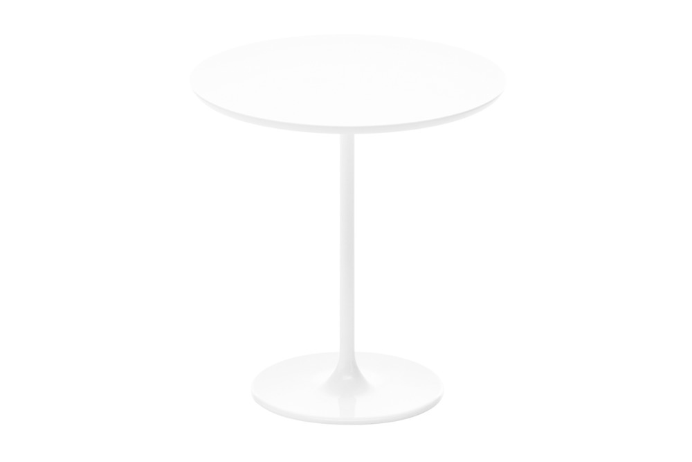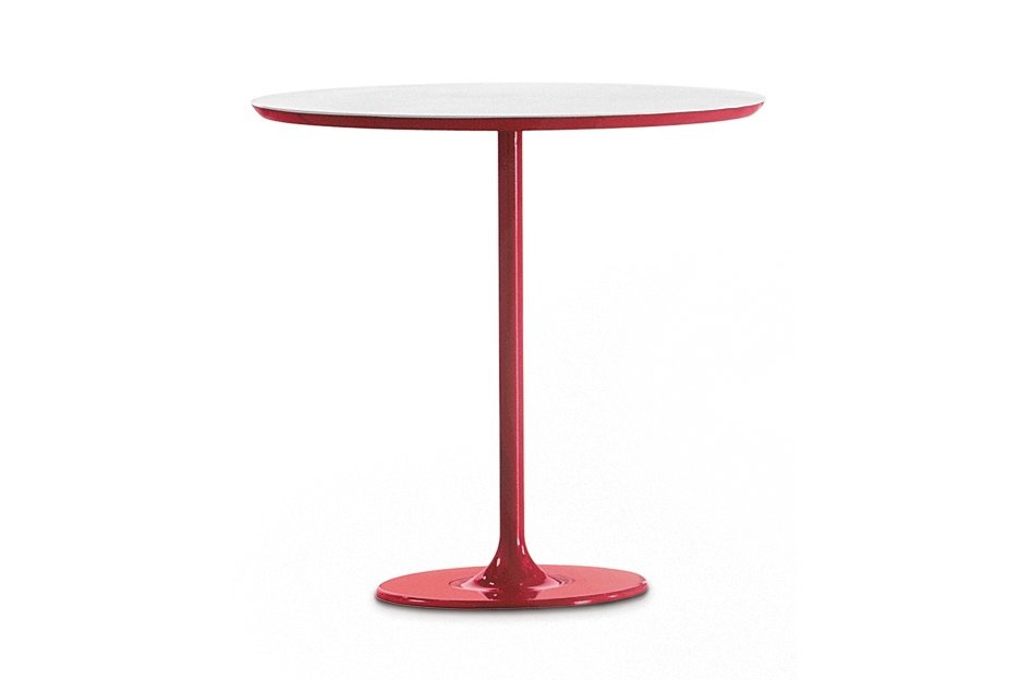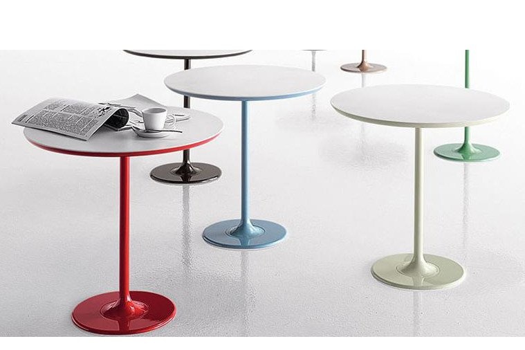 Arper Dizzie tafels met ovaal, rond of vierkant voet in verchroomd of wit gelakt staal. De top is verkrijgbaar in wit reliëf gelakt MDF, in verschillende vormen en maten: ovaal, rond of vierkant. Afmetingen: