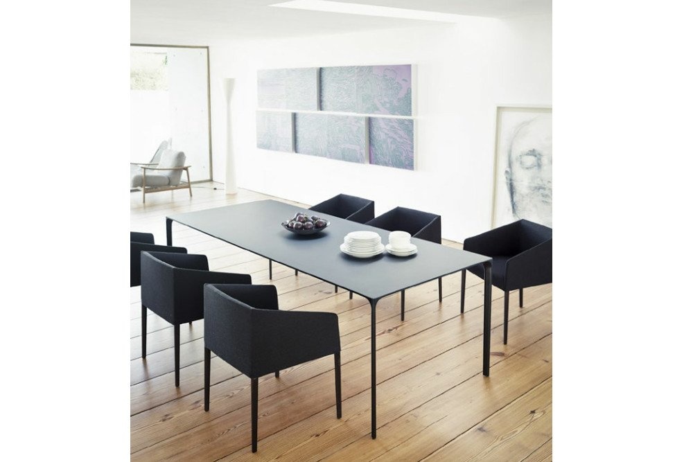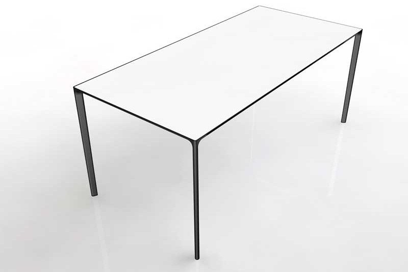 Arper Nuur vergadertafel met vierkante of rechthoekige tafelbladen van verschillende afmetingen, in gelaagd hout of hout gefineerd MDF, met structuur in gepolijst of gelakt aluminium. Alleen de vierkante 140x140 versie is leverbaar in wit en antraciet. Hoogte 74 cm. Afmetingen Arper Nuur
