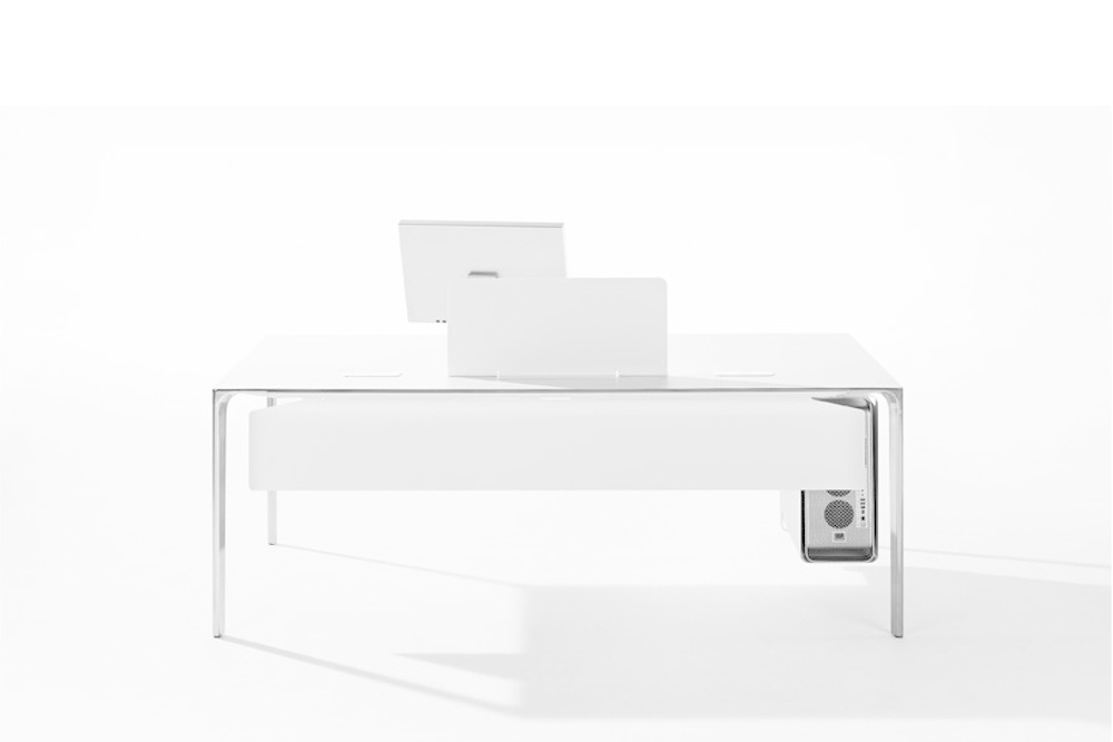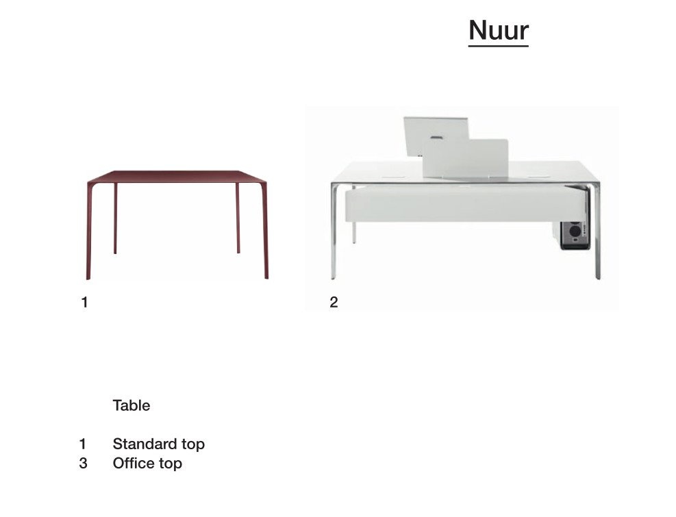Arper Nuur Office heeft een rechthoekig blad voorzien van oogjes, geschikt om te worden voorzien van bureau-accessoires. Tops zijn verkrijgbaar in MDF laminaat of fineer, met gepolijst of gelakt aluminium frame. Hoogte 74 cm. Nieuwe reeks accessoires om Nuur tabel aan te passen aan gebruik op kantoor zijn op aanvraag beschikbaar met een toeslag: schermen, kabeldoorvoeren en houders, pakkingring covers, frontpaneel, PC houders en lades.