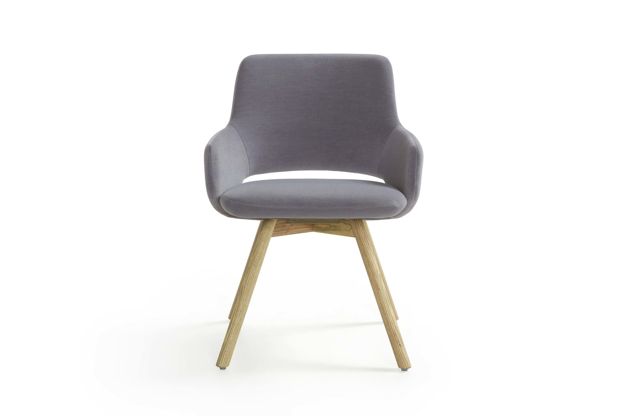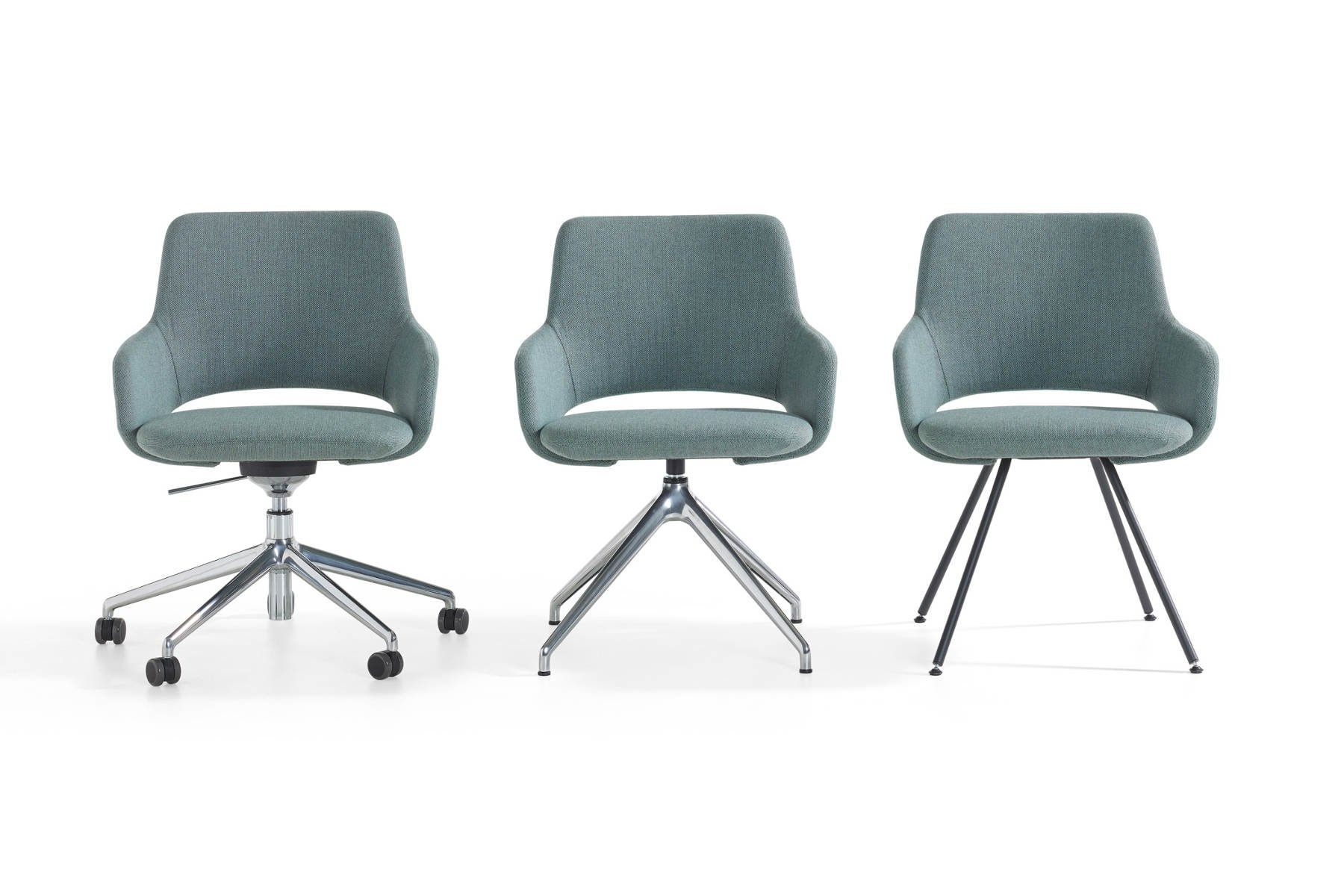 4-teens stoel: onderstel is in een standaard poedercoatkleur. Of tegen meerprijs onderstel aluminium gepolijst. Draaibaar zonder retourmechanisme. Voorzien van zwart kunststof vloerdoppen.