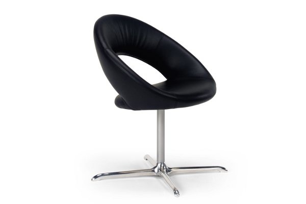De Nina stoel kan ook worden uitgevoerd met een stervoetonderstel, dit onderstel is ook uitgevoerd in gepolijst aluminium en is in hoogte verstelbaar.