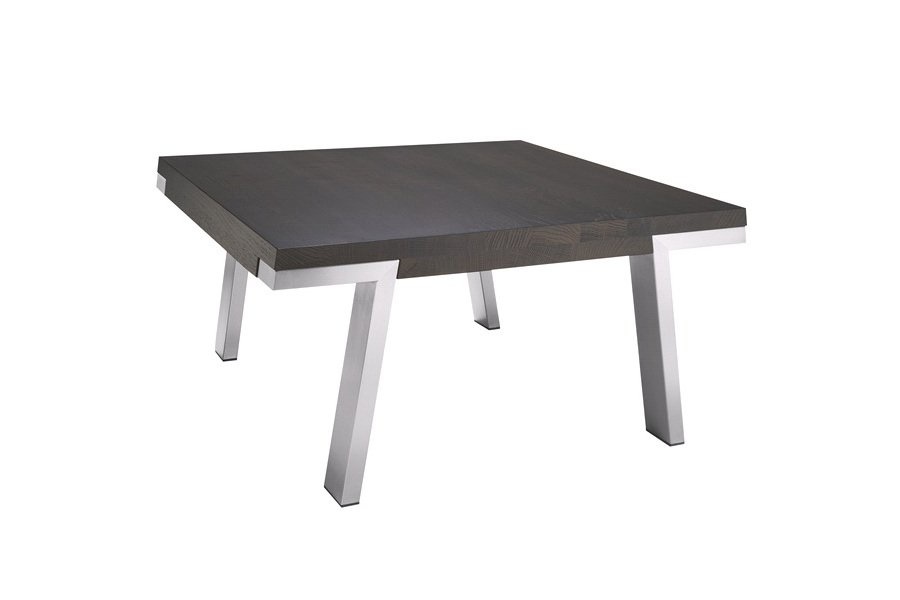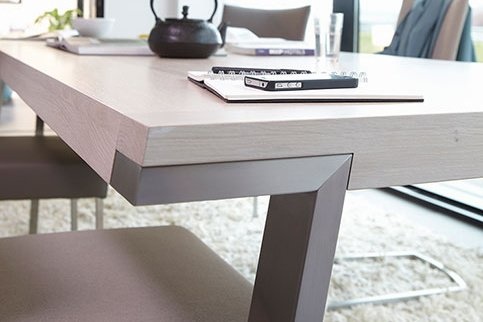 Bert Plantagie Seven tafel heeft een roestvrijstalen onderstel gecombineerd met een dik houten tafelblad. Het blad is gemaakt van beuken-, eiken-, essen-, kersen-, notenhout of HPL. Bij een HPL blad is de tafelrand in kleur gebeitst. De tafel heeft een afmeting van B 100 x H 77 x L 160 tot 260 cm. Materialen