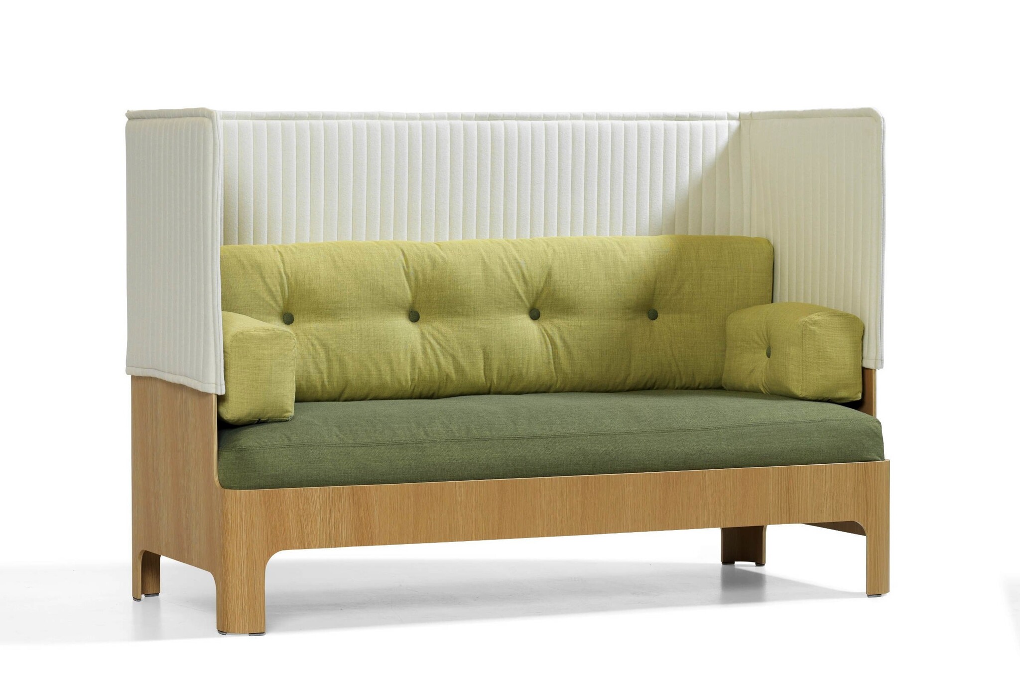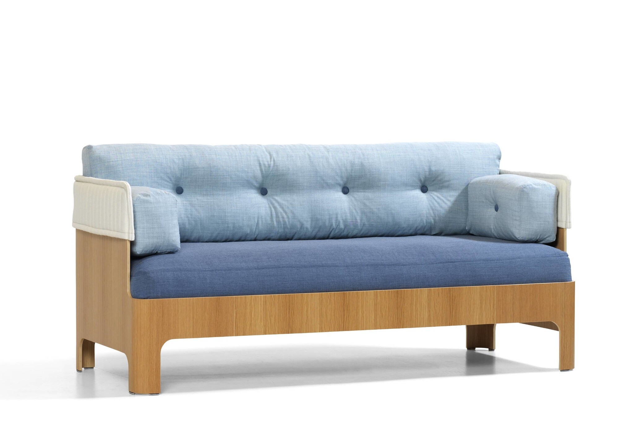 Blå Station Koja bank met een beschermde essenhouten schelp. Met zijn beklede bovenzijde en gevulde kussens is de Koja de perfecte plaats of even te relaxen en je van de buitenwereld af te sluiten. Koja is ideaal voor entrees, lounges, lobbys en bibliotheken, en vele andere locaties. De Koja bank is er in een lage en hoge versie, alsmede als fauteuil. Zithoogte 470 mm, afmetingen 1830 x 740 x 830 mm b x d x h, 1210 mm hoog voor de hoge versie. Bekleding in stof of leer. Een bijpassend meubel is de Bla Station Babel salontafel.