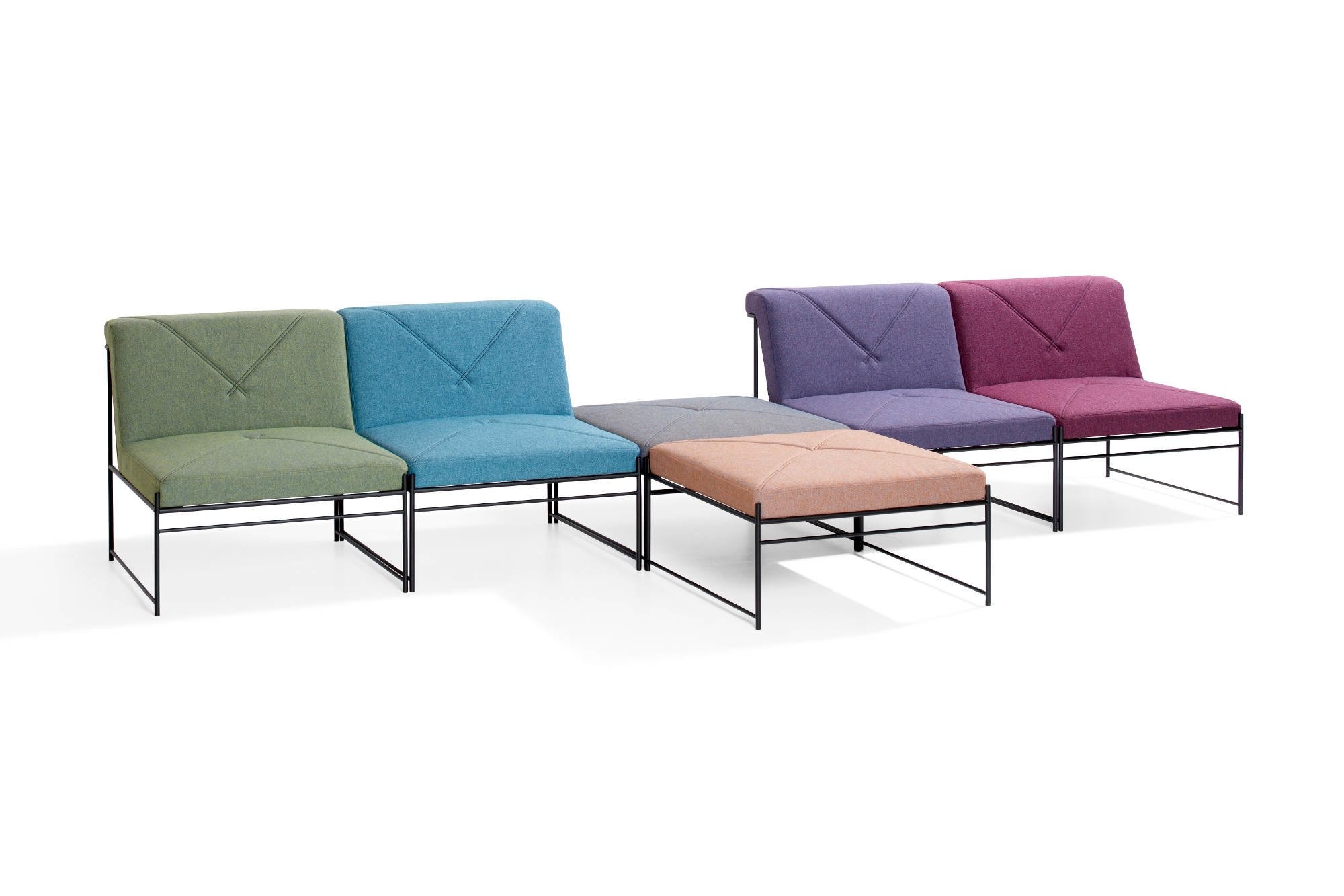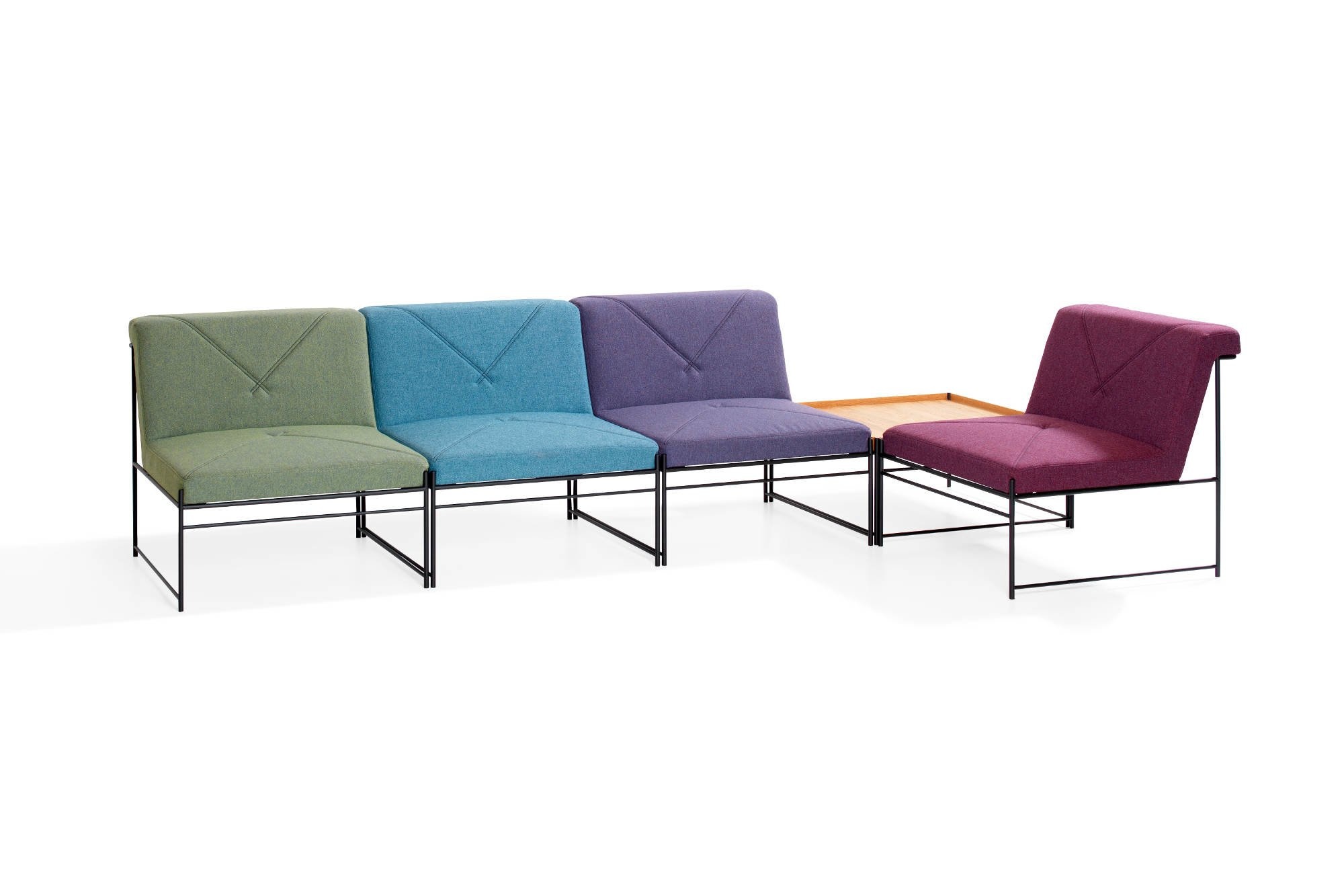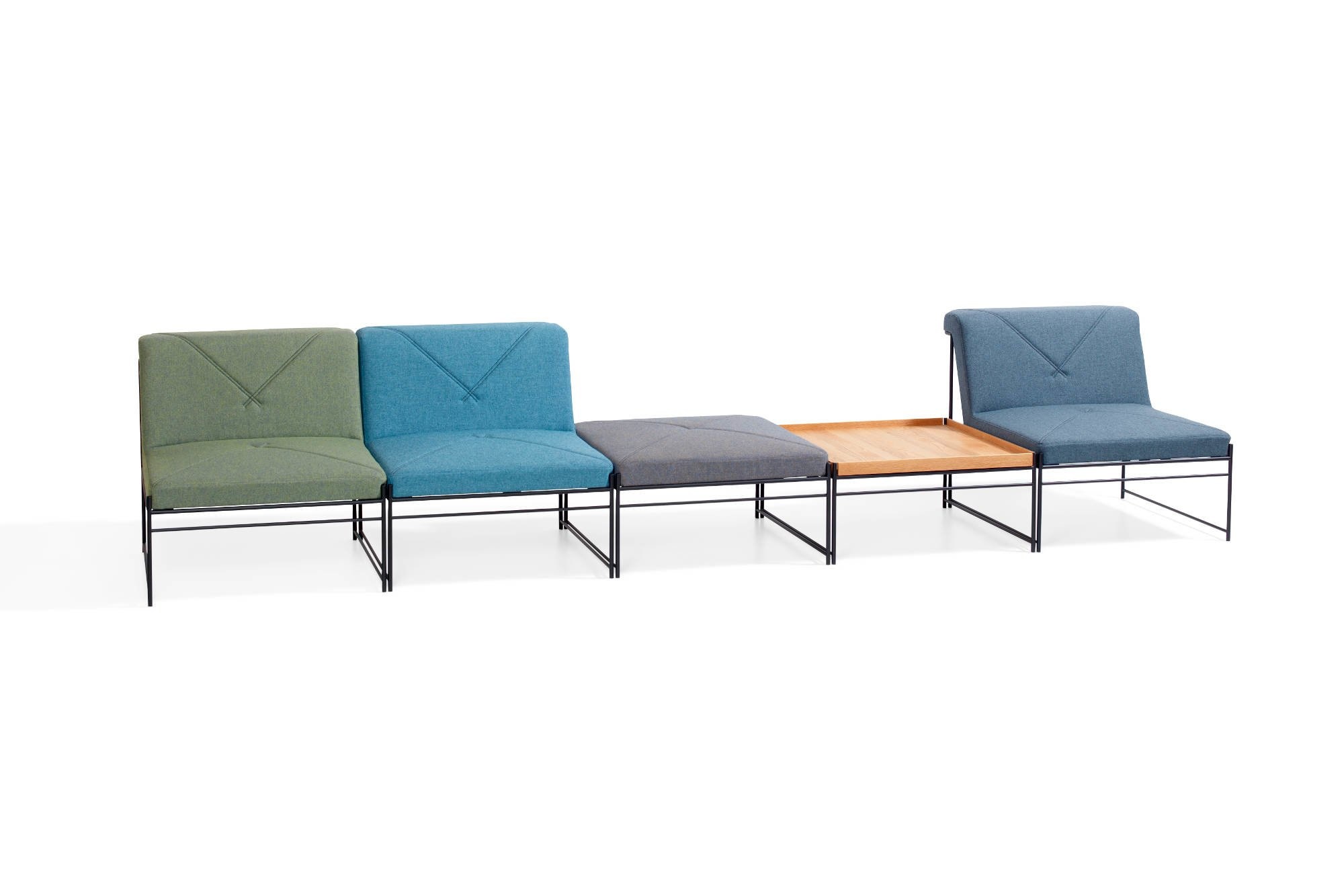 Bla Station Unit koppelbaar modulair zitsysteem en bestaat uit de volgende elementen: een poef, een fauteuil (samen te vormen als bank) en een tafel. Door een frame in horizontale en verticale lijnen lijkt het alsof het zweeft boven de vloer. Ontwerp Tomoyuki Matsuoka Kenmerken Blå Station Unit bank