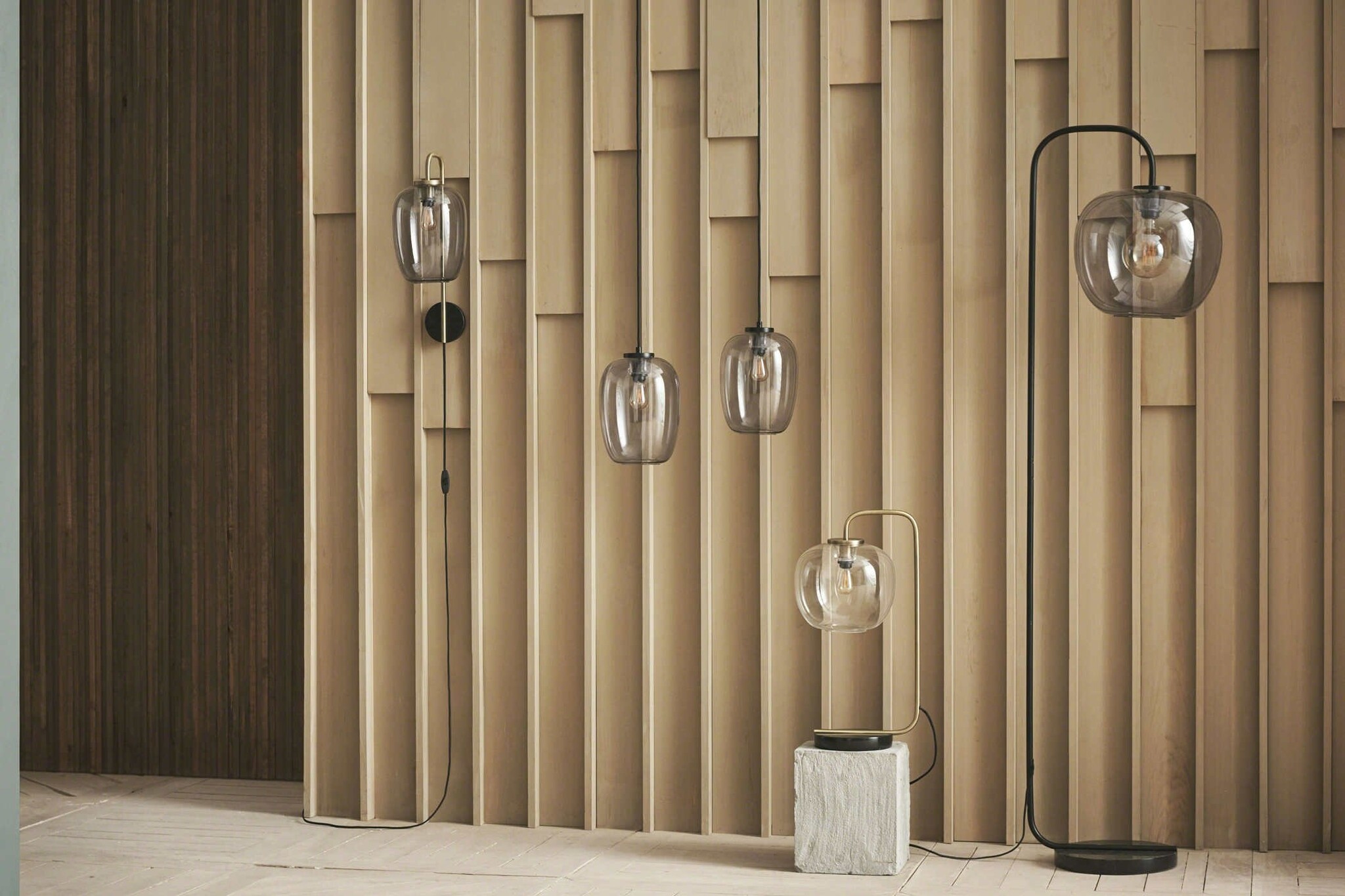 Collectie lampen met hanglampen, wandlamp, vloerlamp en tafellamp