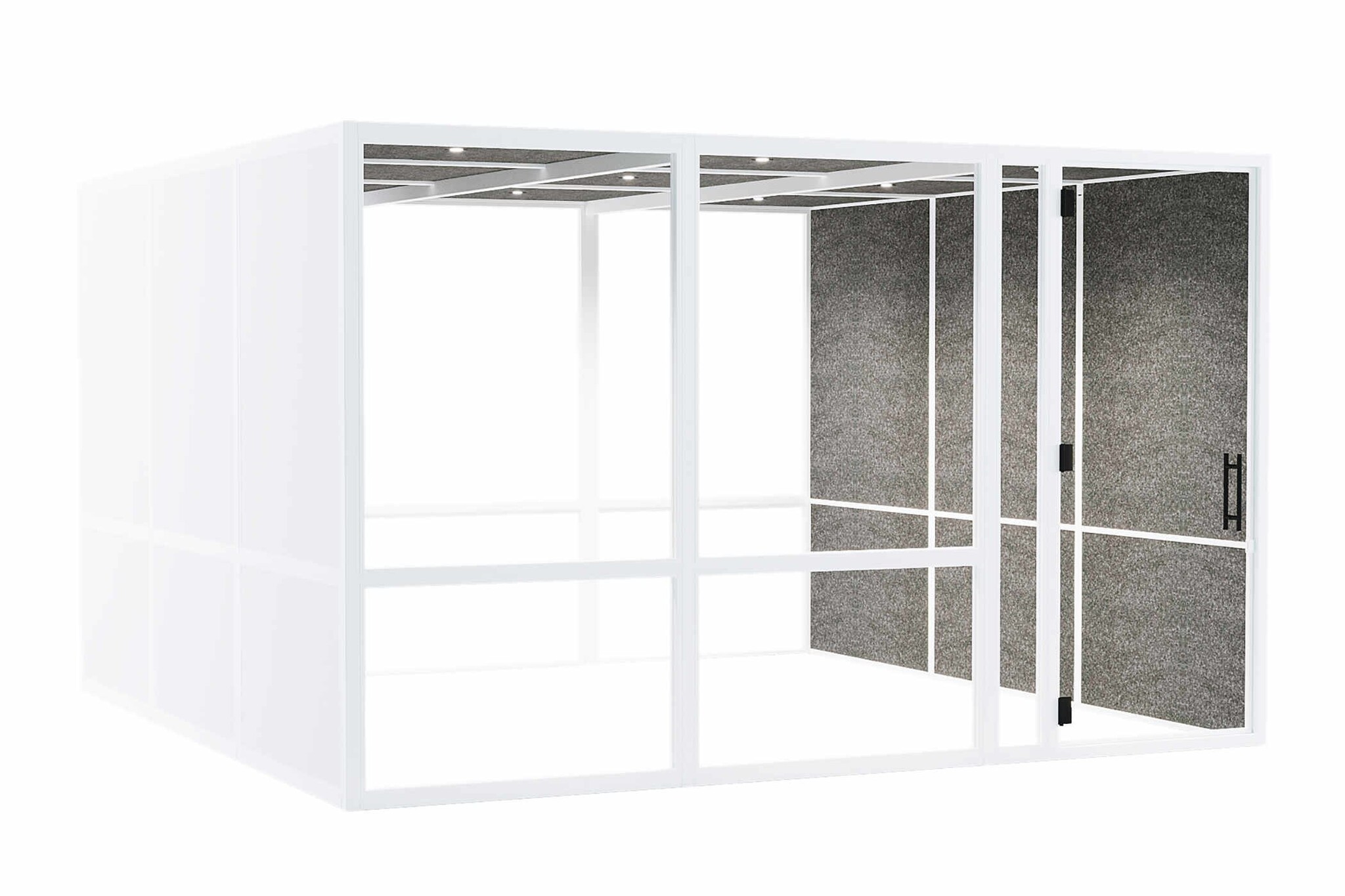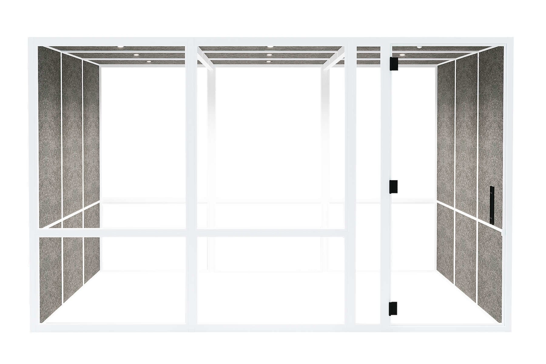 De buitenkant van de BOW Nine akoestische ruimte is te leveren in wit, zwart of zwart met eiken. U kunt kiezen voor een glazen voor- en achterkant of een gesloten achterkant. De gesloten zijkanten (en eventueel de achterwand) zijn voorzien van akoestisch materiaal (vilt) in antraciet.