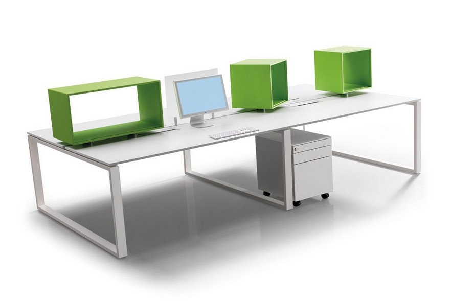 De schermen zijn gemaakt uit spaanplaten met een dikte van 18 mm bekleed met decoratief papier geïmpregneerd met melamineharsen met massief houten ABS afgeronde randstroken met een dikte 1 mm ofwel kunnen ze geverfd worden met polyurethaancoatings. Als alternatief is de versie in microdoorboord weefsel beschikbaar, ondersteund door ruwe spaanplaten met een dikte van 18 mm. In de versie in melamine, geverfd en in weefsel, kunnen ze uitgerust worden met profielen in geanodiseerd aluminium met een doorsnede van 20 mm x diepte van 8 mm met de functie van toebehorendrager. De densiteit van het melamine is 620 kg/m3, klasse E1 met lage uitstoot van formaldehyde volgens de normen ISO. Reactie van klasse 2 bij brand. Schermen met aluminium frameDeze schermen bevatten een paneel in methacrylaat met een dikte van 4 mm in verschillende kleuren ofwel een paneel in microdoorboord weefsel ondersteund door ruwe spaanplaten met een dikte van 18 mm. De panelen zijn gesloten door aluminium profielen met een doorsnede van 36 x 21 mm in het horizontaal gedeelte, met een profiel met een doorsnede van 22 x 4 in het verticaal gedeelte en zijn verbonden middels schroeven. Ze worden ondersteund door speciaal daartoe bestemde metalen beugels op het aluminium bench profiel geplaatst op het centrum van de dubbele post van 124 of 164 cm ofwel middels beugels die aan de balken of de poten kunnen bevestigd worden in het geval van afzonderlijke schrijftafels. Beschikbaar in verschillende lengtes.