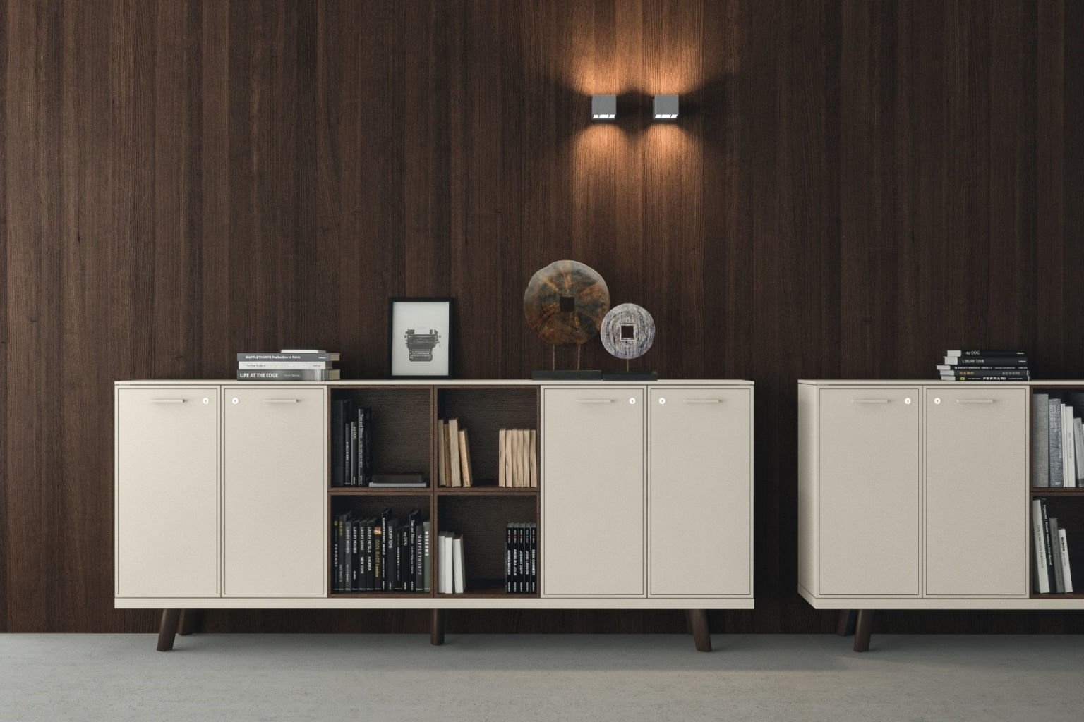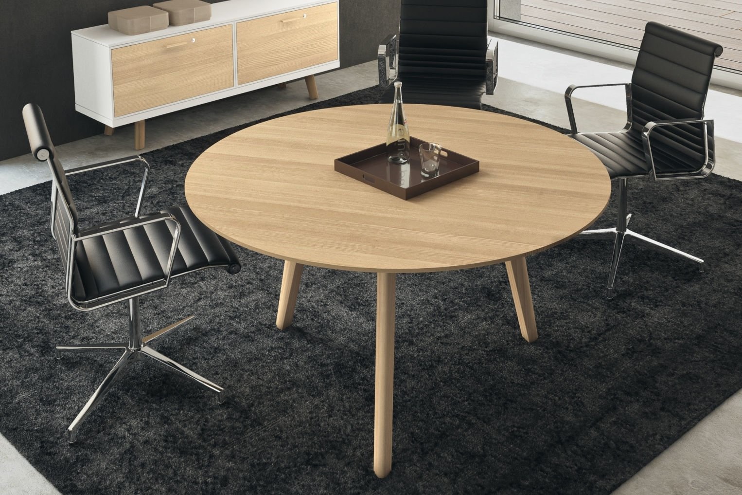 De Bralco Rail is een compleet werkplekprogramma, bestaande uit bureaus, vergadertafels en kasten. De stijlvolle uitgevoerde kantoormeubelen zijn leverbaar in verschillende afmetingen en met verschillende afwerkingen. Elektrificatie in de bladen De bladen van de Bralco Rail vergadertafels kunnen uitgerust worden voor het aanbrengen van ingewerkte stekkerhouders met klep in de lengte aan beide kanten van de tafel, uitgerust met een kabeluitgang. De klep is afgewerkt met hetzelfde houtfineer en in dezelfde kleur als het blad van de Bralco Rail. Glazen tafels De bladen van schrijf- en vergadertafels – van de Bralco Rail zijn in getemperd transparant glas van 12 mm leverbaar. De glazen bladen zijn vastgemaakt aan de metalen en gechromeerde balken met behulp van cilindervormige metalen afstandsstukken van 32 x 35 mm hoogte. Er is een optionele gechromeerde kabeldoorvoerdop met een doorsnede van 80 mm beschikbaar. Bij de Bralco Rail vergadertafels worden de kabels door een gechromeerde kabeldoorvoerdop naar het blad gebracht. Bralco Rail poten De poten van Bralco Rail schrijf- en vergadertafels zijn leverbaar in gerond gepolijst hout en gelakt met verf op waterbasis met open porie. Drie poten met een dikte van 53 mm, voor een totale afmeting van 800 mm en een hoogte van 690 mm. Aan de onderkant bevindt zich een regelbaar pootje van 6 mm. In de twee cirkelvormige ruimten in de poot worden gechromeerde metalen staven gemonteerd voor de verbinding met de balken. Materialen