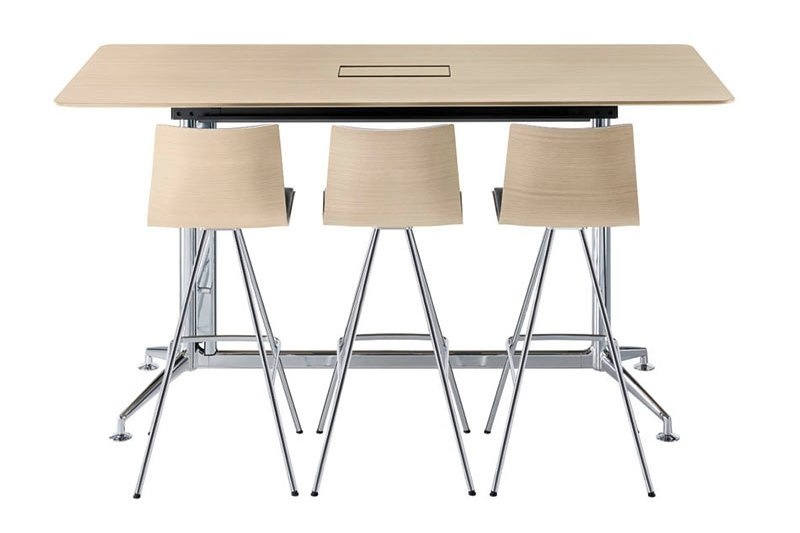Een belangrijk kenmerk van de Brunner Fina Conference tafels: de modulaire opbouw van het onderstel, waardoor de vele varianten mogelijk worden gemaakt. Ook de tafelbladen zijn in veel verschillende modellen verkrijgbaar, van rond naar ellipsvormig tot rechthoekig. Voor de toplaag kan er worden gekozen uit robuust HPL of eiken- of Amerikaans notenfineer. Het tafelblad krijgt door de nieuwe schuine CRK-rand een extra ranke uitstraling.
