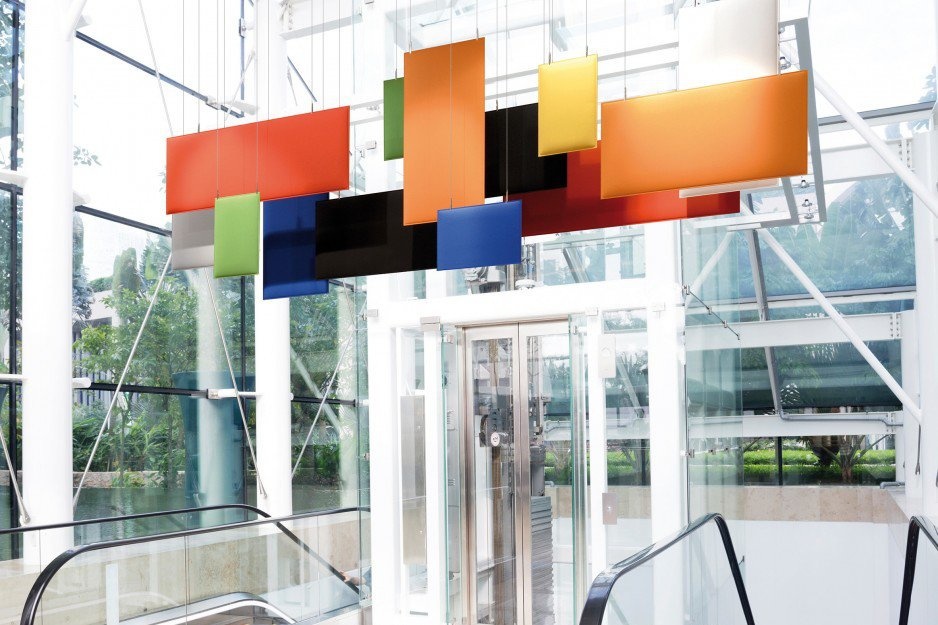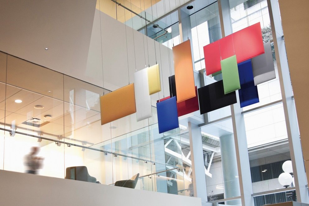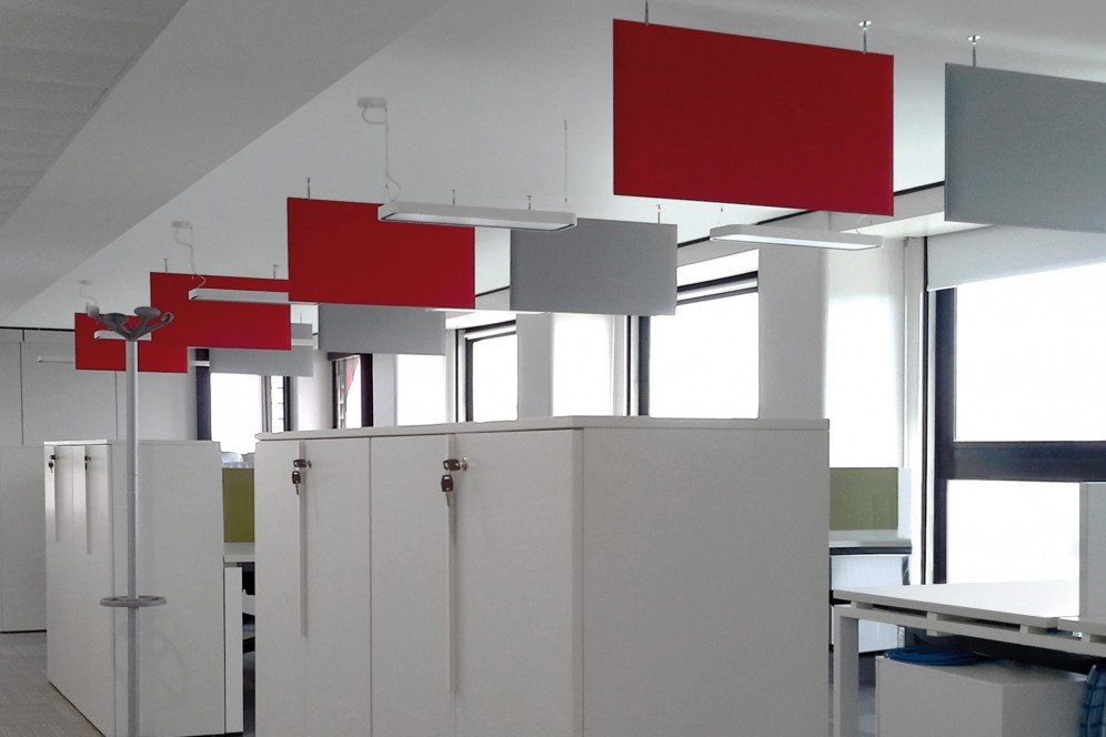 De Cami Baffle akoestische hangpanelen zorgen voor geluidreductie op kantoor. De Baffle van Caimi is een nieuw gepatenteerd systeem dat het mogelijk maakt om Snowsound® geluidabsorberende panelen met staalkabels hangend aan het plafond te hangen. De Snowsound® technologie zorgt voor optimale akoestische prestaties. Dankzij de hoogteverstelbaarheid van de kabels en de vijf verschillende formaten van de akoestische hangpanelen biedt dit systeem optimale flexibiliteit. Hierdoor zijn ze ideaal te gebruiken als geluiddempende panelen in kantoorruimtes zoals open ruimtes, hallen, entrees, vergaderzalen, kantines en tussen de verschillende werkplekken in grotere ruimtes.