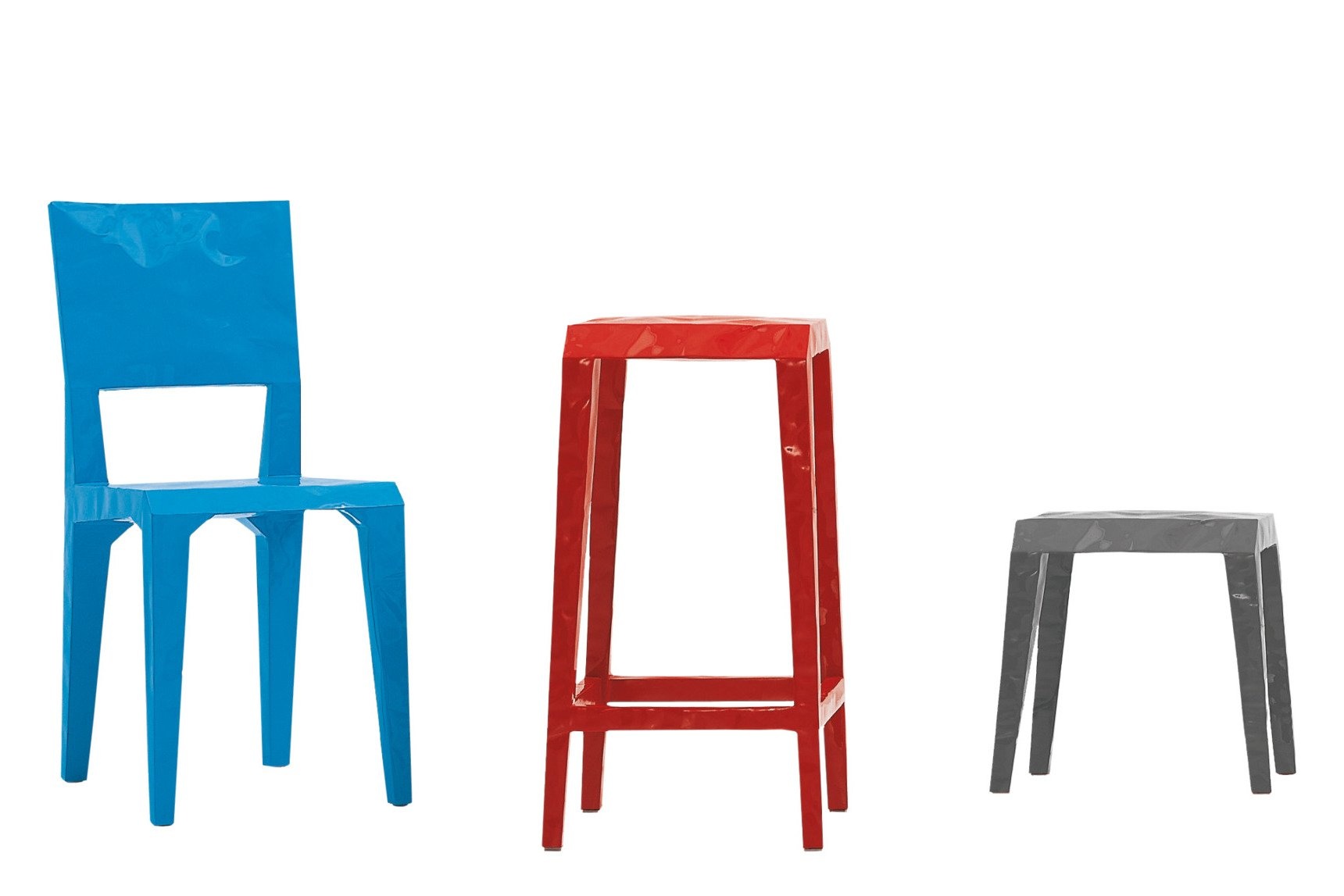 Cappellini Mr. B barkrukken met of zonder rugleuning zijn gemaakt uit een dunne metalen plaat geïnjecteerd met polyurethaan schuim, hoogglans gelakt in wit, blauw, geel, grijs, rood and zwart. Over Cappellini