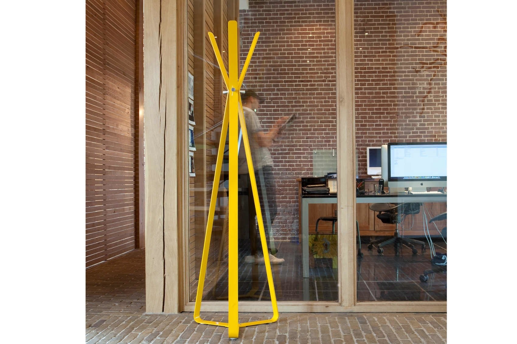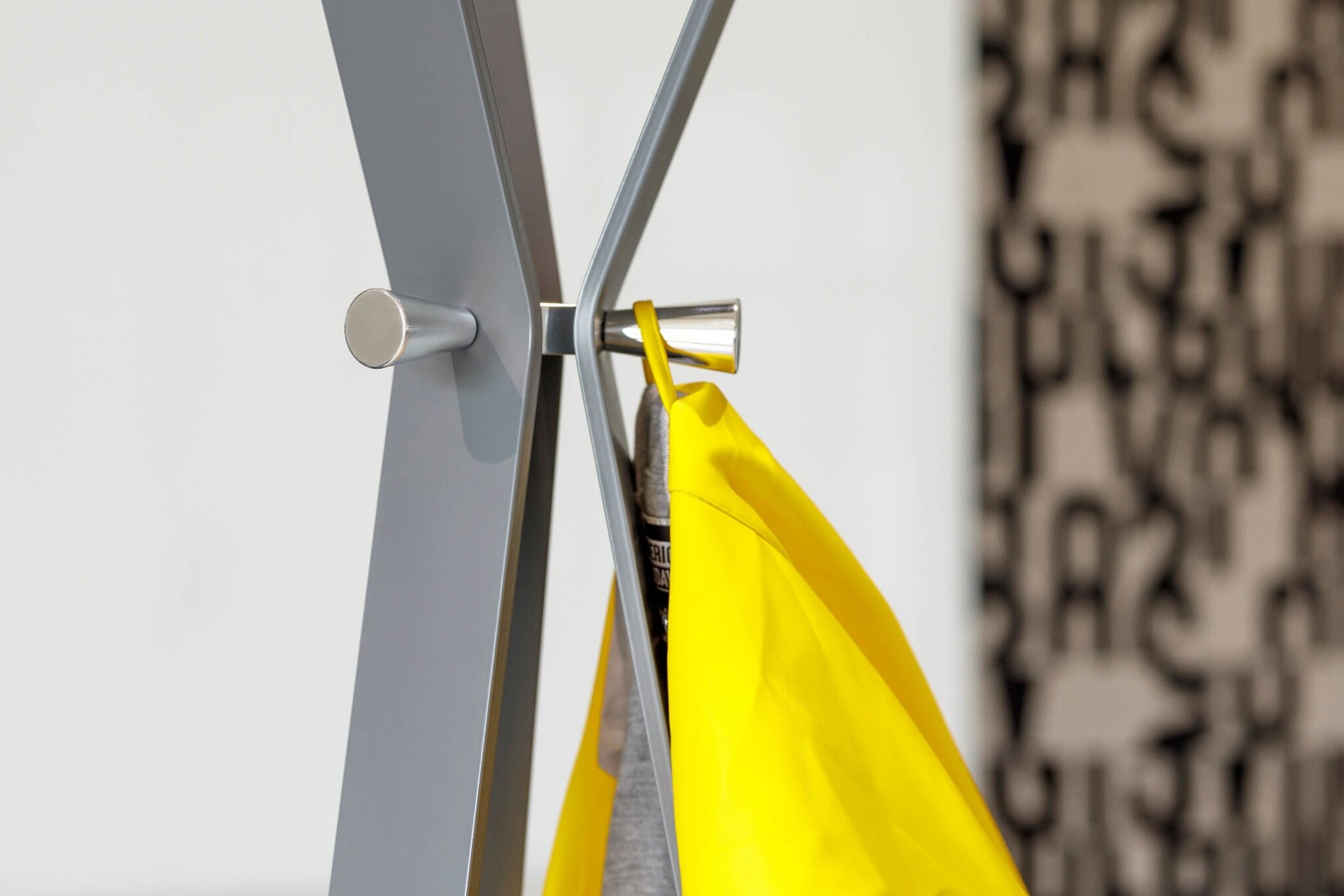 Cascando Bend bestaat uit gebogen metalen staanders die bovenin samen komen. De jas kan zorgvuldig worden opgehangen aan het uiteinde van de strip of aan de gepolijste aluminium knoppen waarmee de gebogen metalen zijn verbonden. De Bend is leverbaar in het wit, geel en grijs en is van gepoedercoat staal gemaakt.