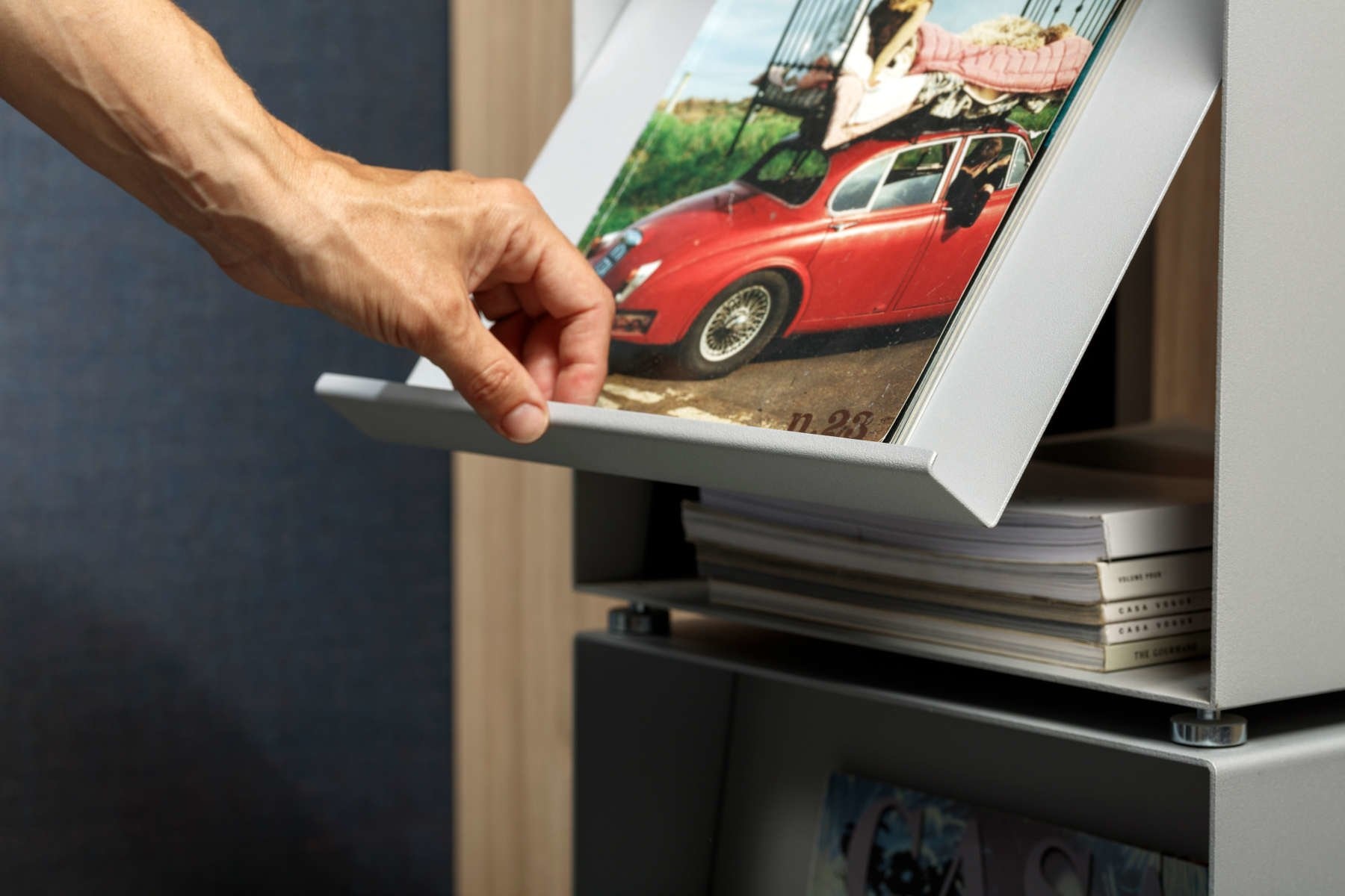 Cascando Box01 brochurebox maakt deel uit van het opbergsysteem Box01. De brochureboxen zijn eenvoudig stapelbaar en hebben magnetische voeten. Achter het inklapbare brochurepaneel is opbergruimte voor extra brochures. Combinaties met andere opbergoplossingen uit het opbergsysteem Box01 zijn uiteraard mogelijk. De brochurerand is 30 mm diep. Een helder ontwerp, overal op zijn plek.