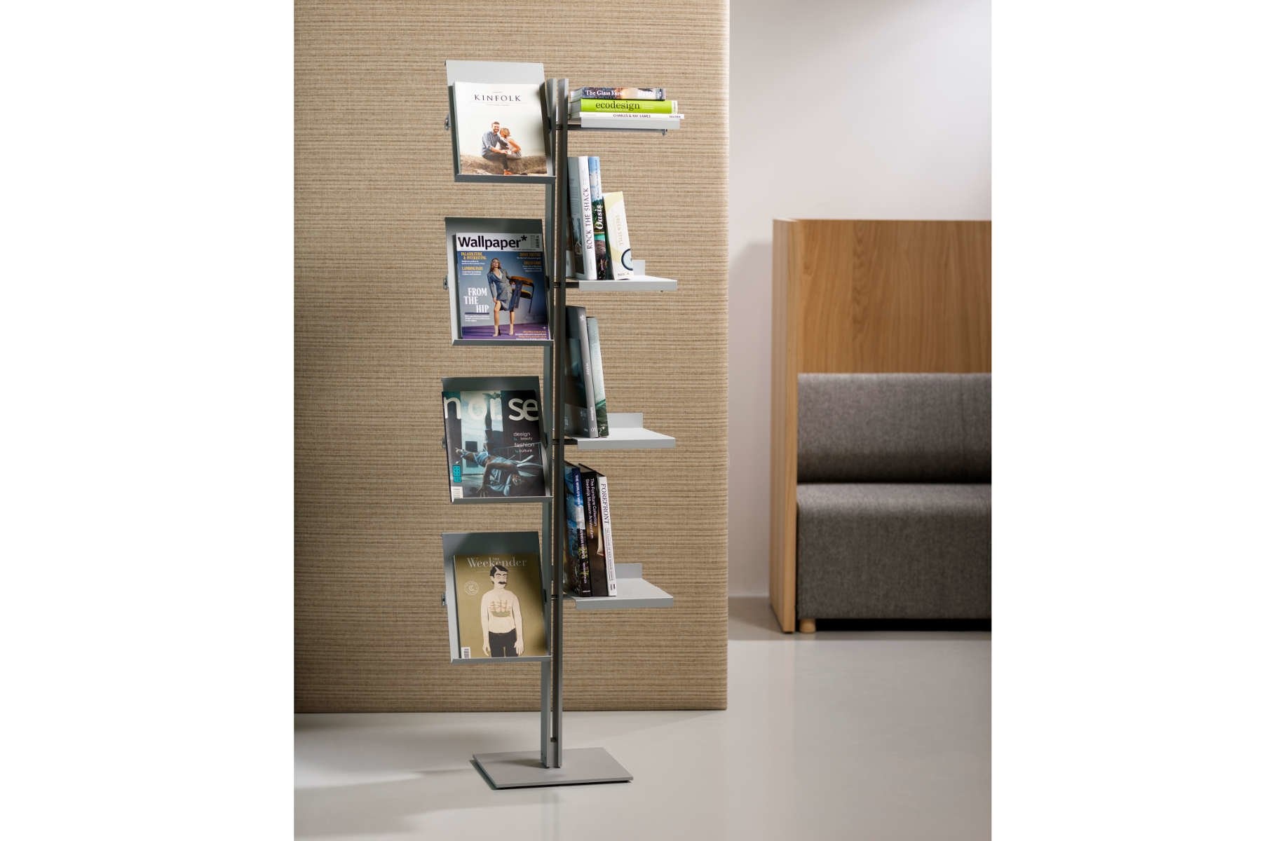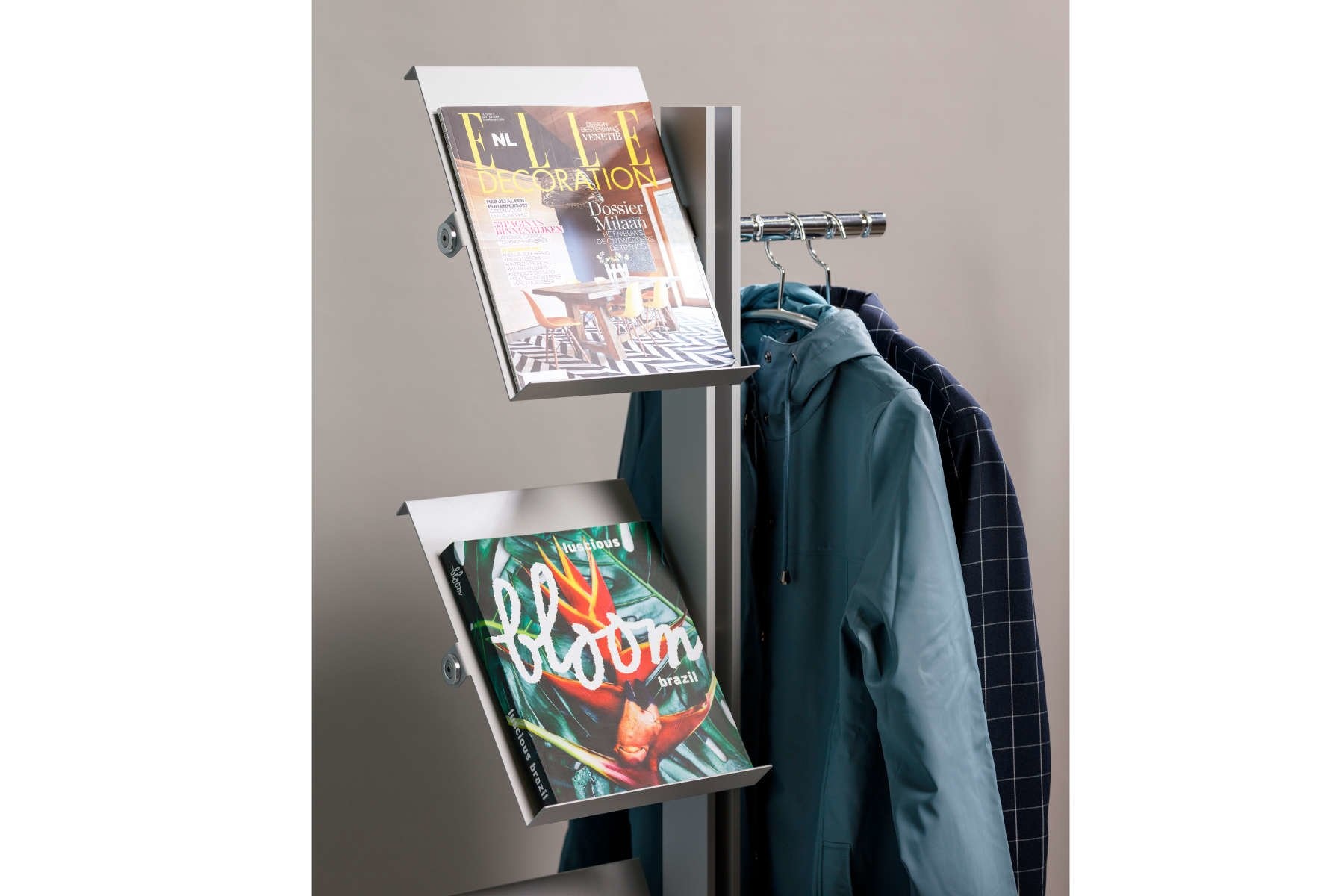 Cascando Flexxible brochurehouder en/of boekenrek is leverbaar in diverse uitvoeringen, variërend van één tot vier panelen. Bij de Flexxible kunnen de panelen zowel schuin als horizontaal geplaatst worden. Fraaie details in gepolijst aluminium en de stabiele voet van staal geven het ontwerp kwaliteit en karakter.
